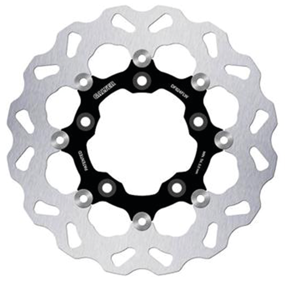 Galfer brake discs for use with stock and stock-replacement calipers. Full floating discs have stainless steel outer bands with black coated steel centers, held by and clear stainless floating elements. As with every brake disc it is strongly recommended to install new brake pads with a new brake disc.