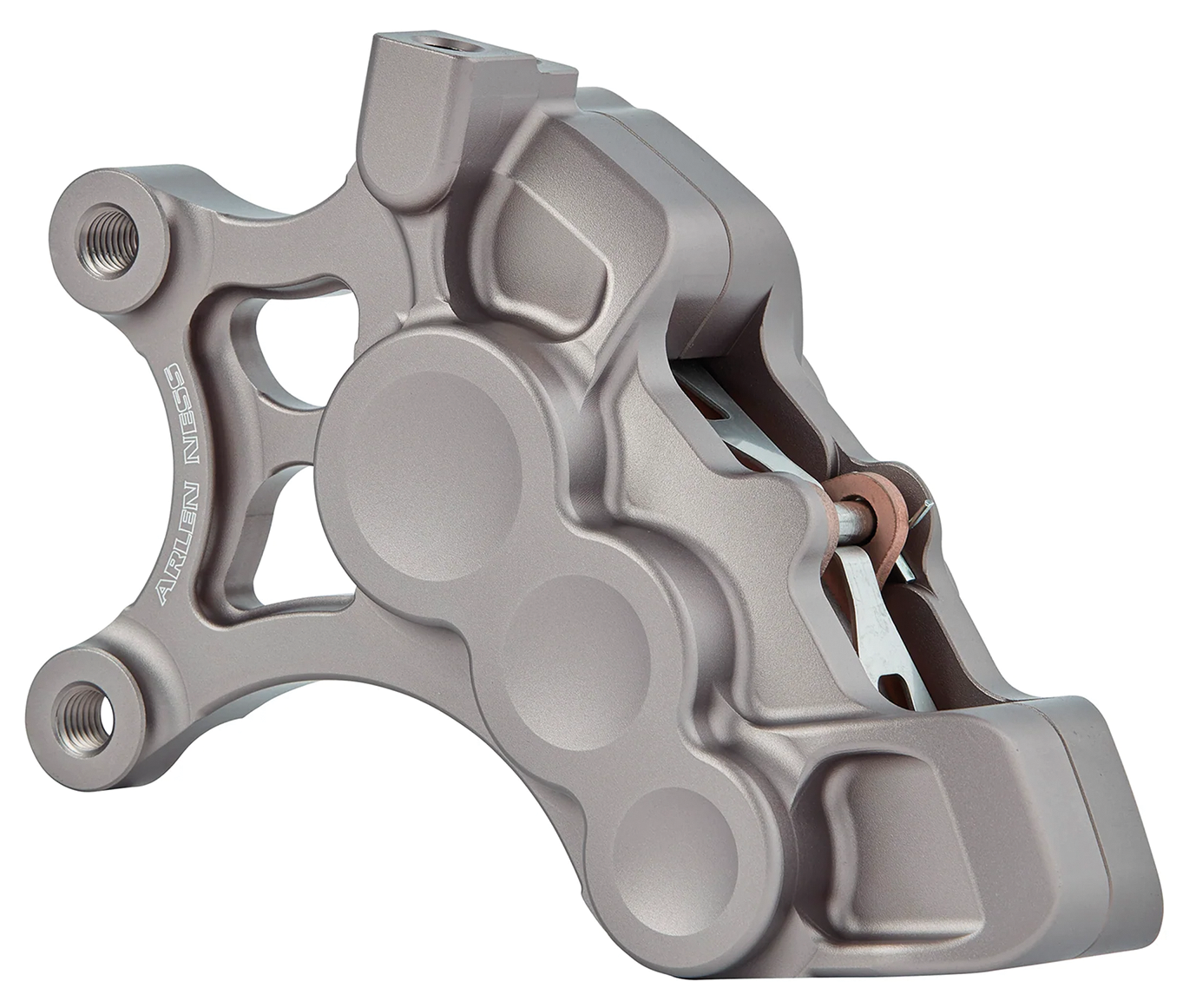 Fits Touring 2000 to present, Softail 2000 to present, Sportster 2000 to present and Dyna 2000-2005 in conjunction with Arlen Ness 14″ brake rotors, Left side 14″ front brake caliper, titanium