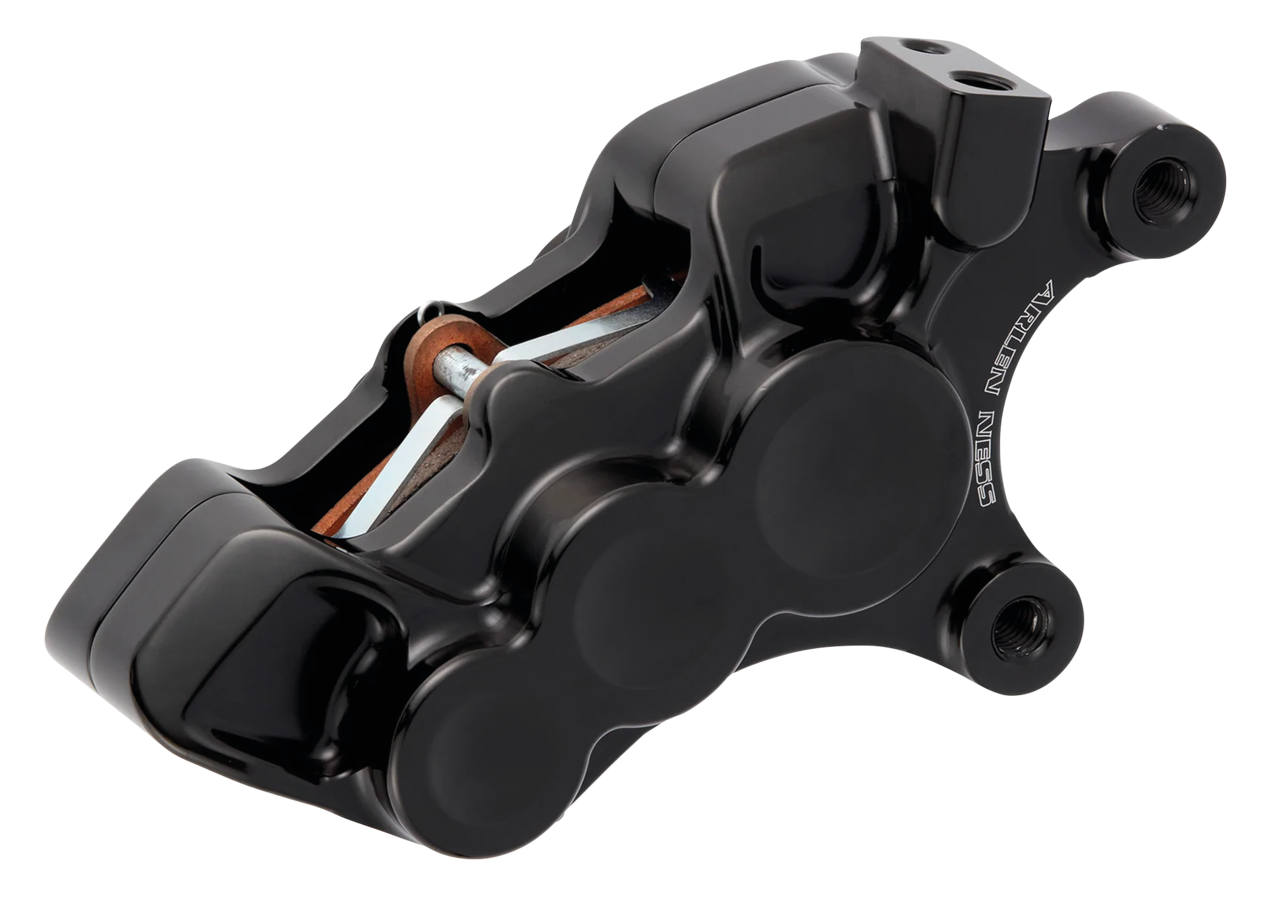 Fits with 11.8″ (300mm) disc rotors on Touring 2000 to present, Softail 2000 to present with 41mm or 49mm forks, XL Sportster 2000 to present with 39mm or 49mm front forks, V-Rod 2002-2017 with 49mm forks and Dyna 2000-2005Models with 11 1/2″ disc must convert to 11.8″ (300mm) disc, Right, black, Ness 6-piston 11.8″ caliper black right, Arlen Ness
