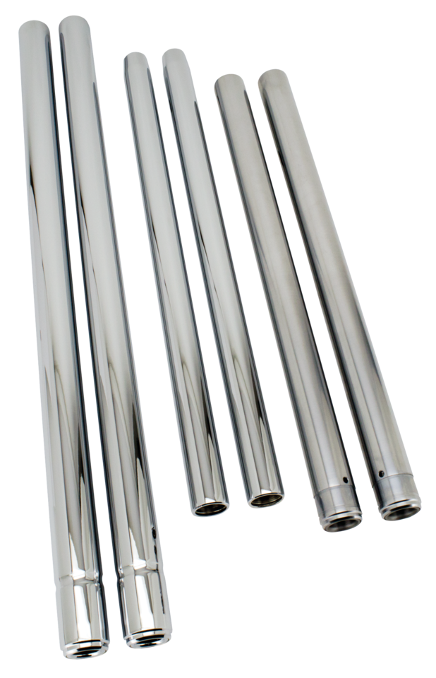 Show chrome fork tubes for most Harley models 1949 to present in stock, under stock and over stock length. Over stock length come complete with spring spacer where required, but it is strongly recommended to check fender to lower triple tree and wheel to engine and wheel to controls clearances when fitting longer or shorter fork legs. Fork tubes are sold in pairs.