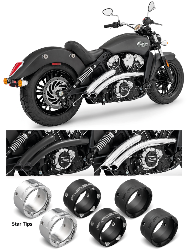 Fits all Indian Scout 2015-2024, Chrome with sculpted black Slash Cut tips, Freedom radical radius ISC15-24 Chr/Blk, Freedom Performance Exhaust