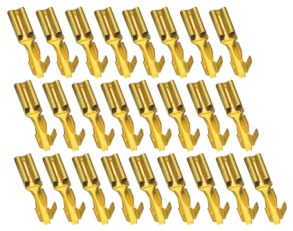 Female 1/8″ spade style crimp-on wire terminals for #16-20 gauge wires, dealer pack of 25 pcs. (OEM 9904)