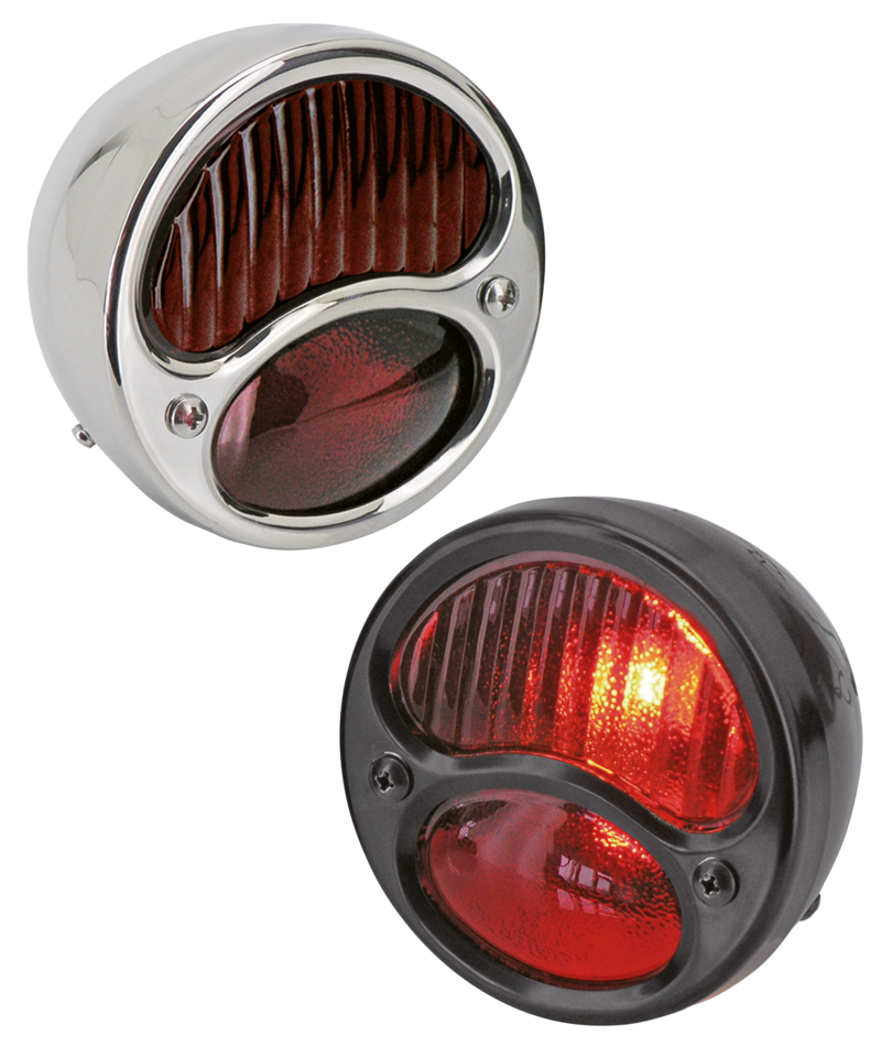 Classic style taillight with true Old School details like cork seals and real glass lenses. Light is 3 7/8″ (9.8 cm) in diameter, has a 2 3/8″ base with two-bolt construction and is 2 1/8″ (5.4 cm) deep. Housing and trim ring are stainless steel. Features one bulb for taillight and license plate illumination, and another bulb for brake light. Comes pre-wired.