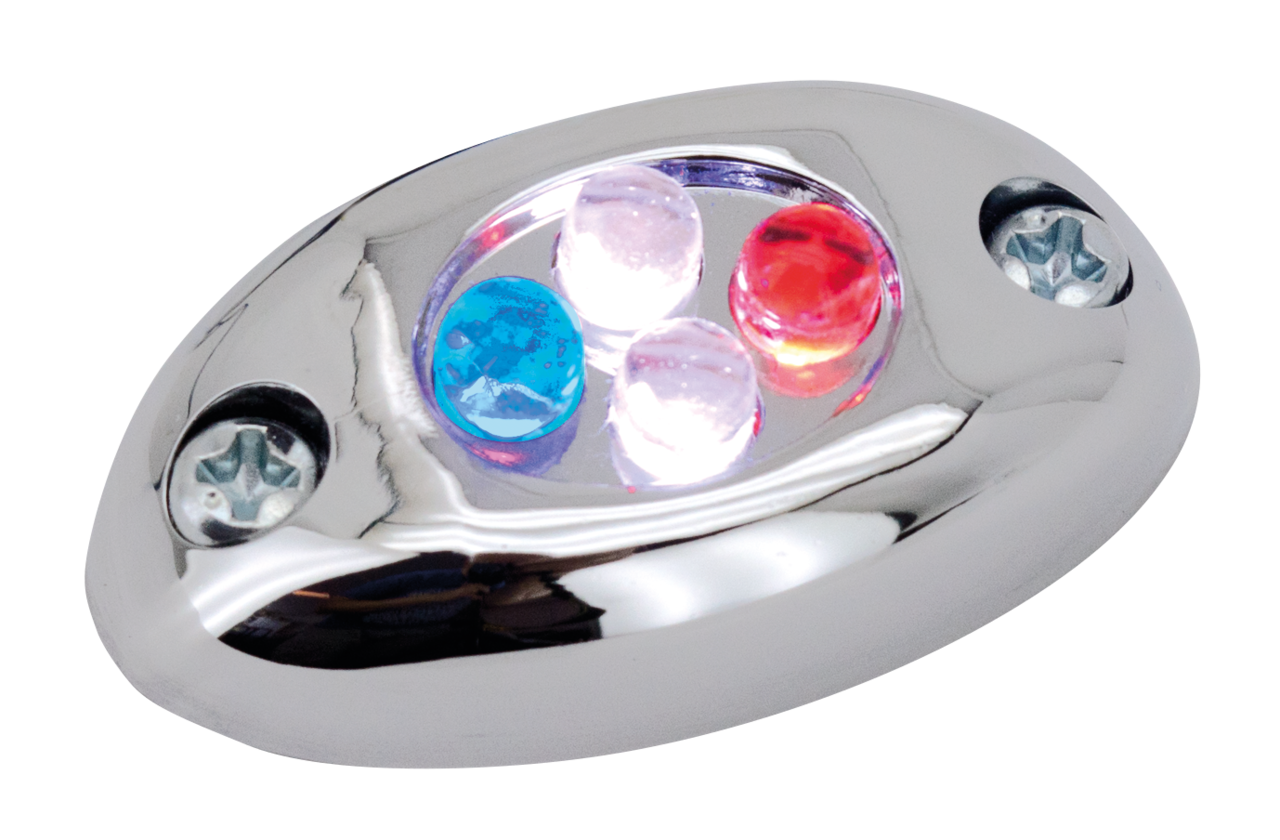 Multicolored LED’s (red/white/blue) in a compact chrome housing, can be used as accent light or as auxiliary turn lights. To be installed either with two screws or two-sided tape, depending on the application. Housing measures only 3/4″ high, 1 1/2″ wide and 1/2″ deep. Sold each.