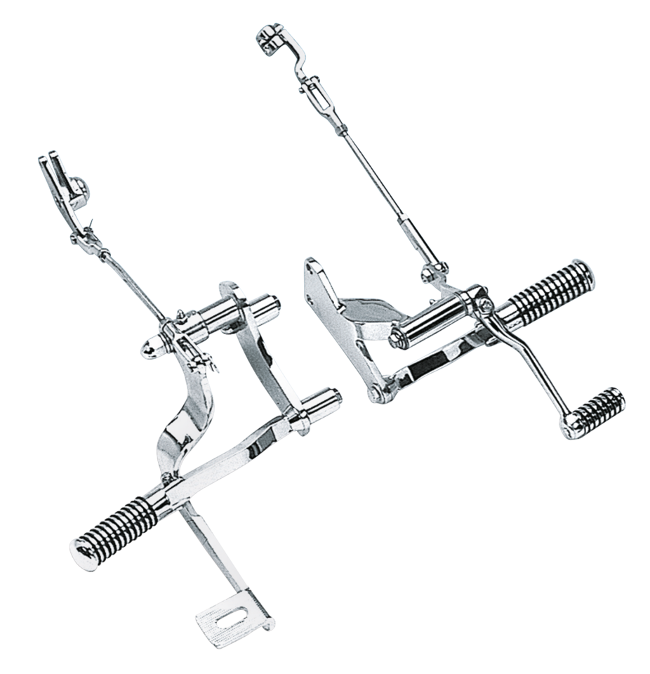 Comfort, style and a custom appearance are combined in these American engineered forward control sets. Available from Zodiac for the latest Harley models. Sets are available for all 5 Speed FXR models Harley-Davidson, Shovelhead or Evolution powered 1982 thru 1994 and for the 1986 thru 2003 Evolution powered 883-1100-1200 Sportster. These controls are easy to install without removing the primary covers. All parts are show-chromed and complete with Zodiac’s O-ring foot pegs. This is the way to go for easy Hi-Way cruising and a superb Custom look.