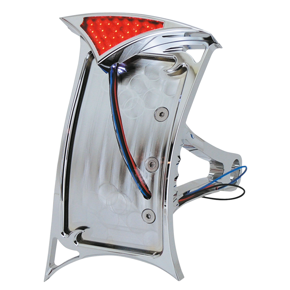 Machined from billet aluminum with a chrome plated finish. Almost 30 brilliant LED’s are used in the taillight, they will get you noticed anywhere. Comes pre-wired and is available in two styles, a flat and a radius version. The area to mount the licenseplate measures 4″ x 6 11/16″ (100 mm x 170 mm). The LED taillight is also separately available.
