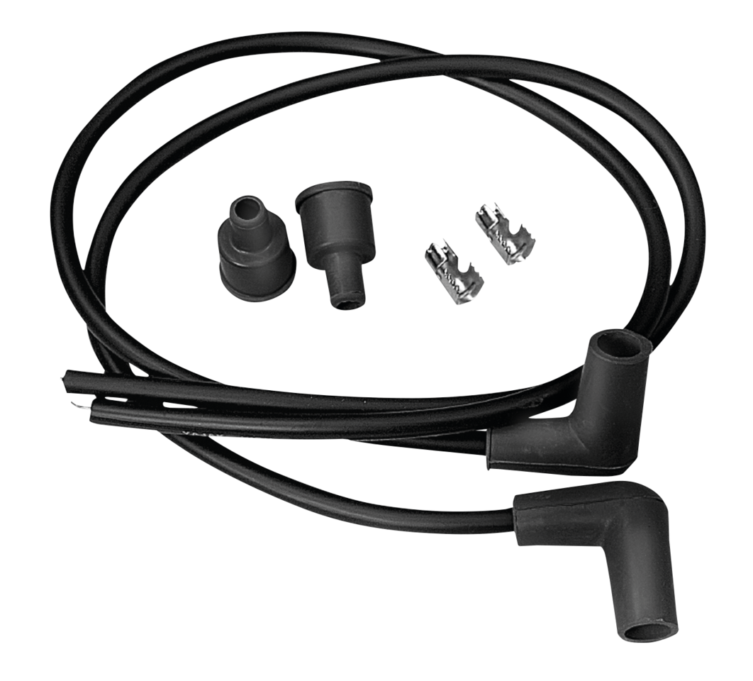 20″ long (50 cm) with spark plug cap. Will fit any coil with “plug-in” connector as used on Harley’s. Also fits our dual lead coils (non resistor type) (OEM 31981-65B).