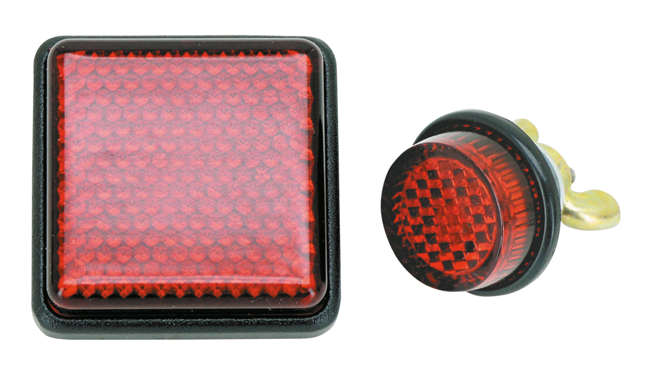 For your personal safety we have both round style and square style reflectors in our program. All reflectors feature acrylic lens with black bolt-on mounting base. Round style is 20mm (approx. 3/4″) in diameter. Square style is 1 3/8″ x 1 3/8″ (35 x 35mm). Both are just 10mm thick. Sold each.