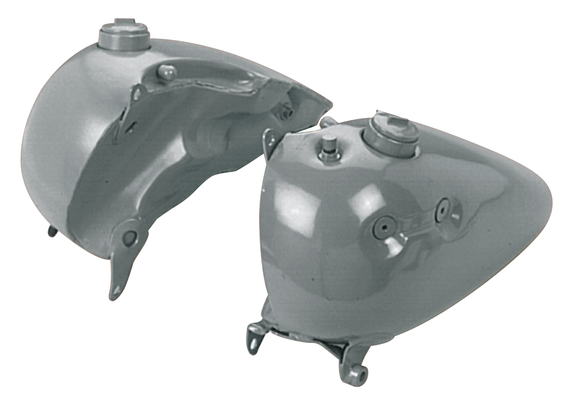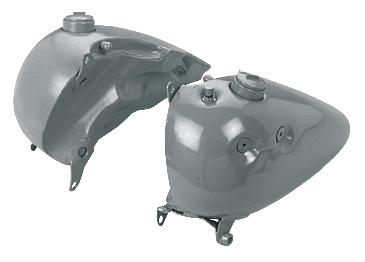 The hand shift style 3.5 gallon (13.2L.) tank set as used on 1947-1965 Big Twin Harley-Davidson has been unavailable for many years. This one is in fact a Shovelhead gas tank but completely modified to fit 1947-1965 Big Twin frames and to take a 1948-1965 rod type shut-off valve, 1947-1965 shifter guide and 1948 style crossover line. Takes 1965 thru early 1973 style cam lock style gas caps. Tank set weighs 6.88 KG.