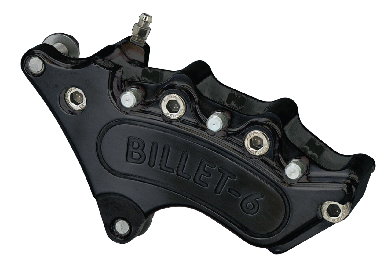 Harrison Engineering was, back in 1986, one of the first companies to design and develop a multi-piston aftermarket caliper for Harley-Davidson motorcycles. Each fully progressive 4 or 6 Piston caliper is precisely CNC machined from lightweight blocks of aircraft quality aluminum alloy. To keep the internal tolerances to a minimum, the caliper pistons are machined from special low expansion aluminum alloy and have a hard anodized finish that has the same anti-wear properties as hardened steel. For maximum performance the calipers have one pad for each piston. Harrison claims this gives a more āleading edge bite’ on the disc than any two pad, or differential bore calipers. It is also especially beneficial in wet conditions, because the first set of pads sweep water off the disc, while the following 2 or 4 pads are still ābiting’ on the disc. That removes the effect of the calipers āskating’ on the disc, and then braking sharply and suddenly when the disc becomes dry. They are truly progressive calipers, with a direct and sensitive relation between the amount of lever pressure, and the amount of braking power. These show polished or black anodized calipers not only have ultimate stopping power, they also have the ultimate looks, and are available for almost all models. The front calipers bolt straight to the front fork bottom leg, and the rear sets include the mounting bracket. Stainless steel shims, to space the caliper to the disc, and mounting bolts are included with each kit. The front as well as the rear sets are available in both 4 or 6 piston versions, as well as polished or black anodized. Matching design brake rotors can be found elsewhere in this catalogue. All Harrison Billet calipers are approved, and come with a limited lifetime warranty on piston wear.