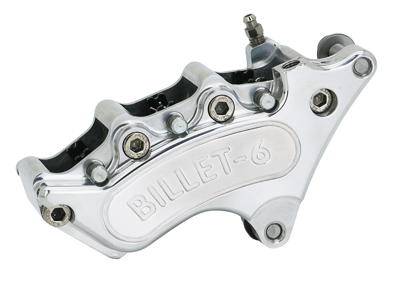 Harrison Engineering was, back in 1986, one of the first companies to design and develop a multi-piston aftermarket caliper for Harley-Davidson motorcycles. Each fully progressive 4 or 6 Piston caliper is precisely CNC machined from lightweight blocks of aircraft quality aluminum alloy. To keep the internal tolerances to a minimum, the caliper pistons are machined from special low expansion aluminum alloy and have a hard anodized finish that has the same anti-wear properties as hardened steel. For maximum performance the calipers have one pad for each piston. Harrison claims this gives a more ‘leading edge bite’ on the disc than any two pad, or differential bore calipers. It is also especially beneficial in wet conditions, because the first set of pads sweep water off the disc, while the following 2 or 4 pads are still ‘biting’ on the disc. That removes the effect of the calipers ‘skating’ on the disc, and then braking sharply and suddenly when the disc becomes dry. They are truly progressive calipers, with a direct and sensitive relation between the amount of lever pressure, and the amount of braking power. These show polished or black anodized calipers not only have ultimate stopping power, they also have the ultimate looks, and are available for almost all models. The front calipers bolt straight to the front fork bottom leg, and the rear sets include the mounting bracket. Stainless steel shims, to space the caliper to the disc, and mounting bolts are included with each kit. The front as well as the rear sets are available in both 4 or 6 piston versions, as well as polished or black anodized. Matching design brake rotors can be found elsewhere in this catalogue. All Harrison Billet calipers are approved, and come with a limited lifetime warranty on piston wear.
