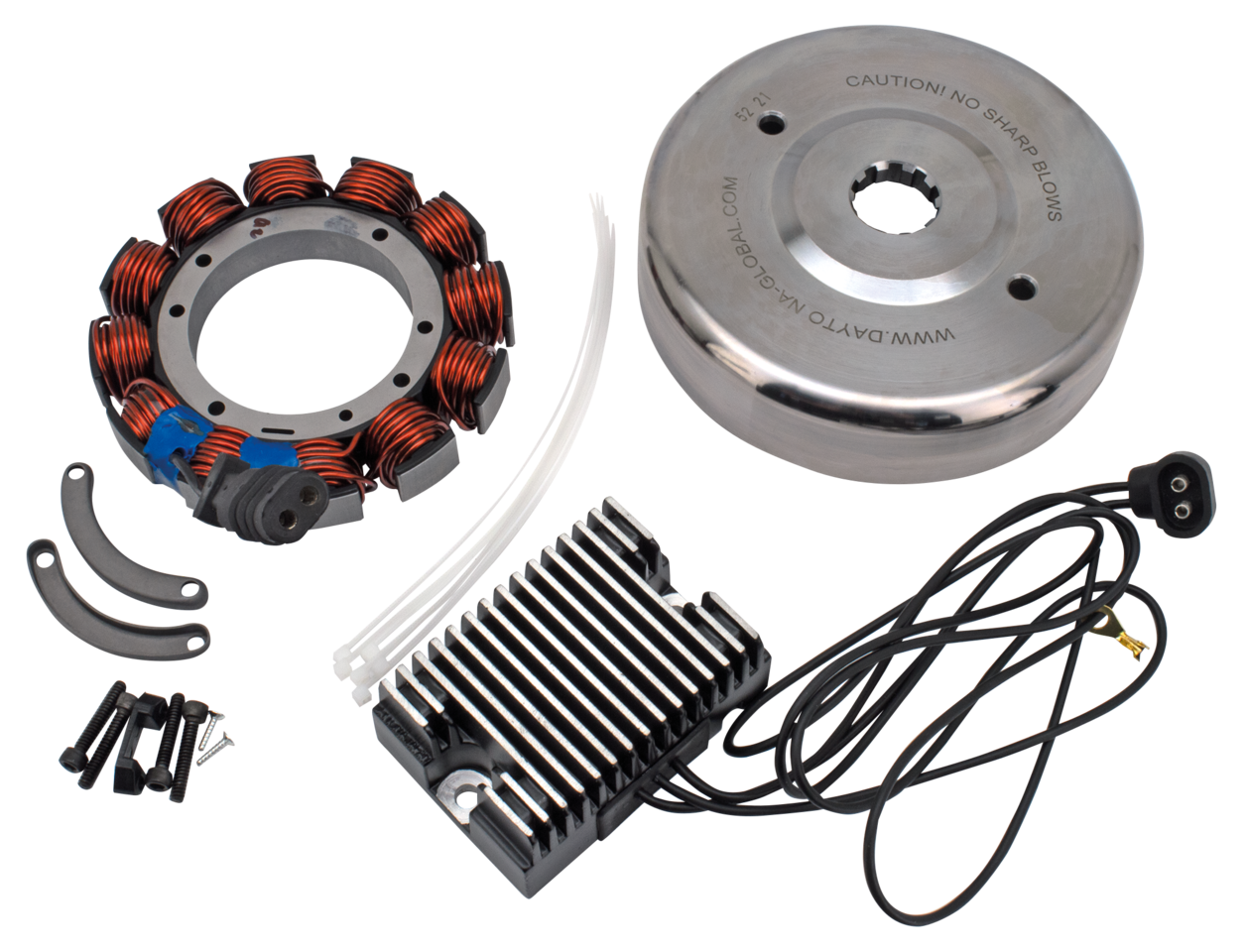 Complete 32 Ampere charging system, fits most Big Twin 1970-1999. It consists of a high performance rotor, stator with hardware and a rectifier/regulator in your choice of black painted or chrome.