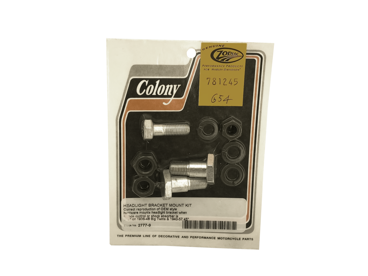 Colony hardware kits with 2 shoulder bolts as OEM 67817-36, one bolt as OEM 4000, nuts and washers for models without Ride Control or shock absorber, White plated, Headlight bracket mounting kit 36-48 WhP, Colony