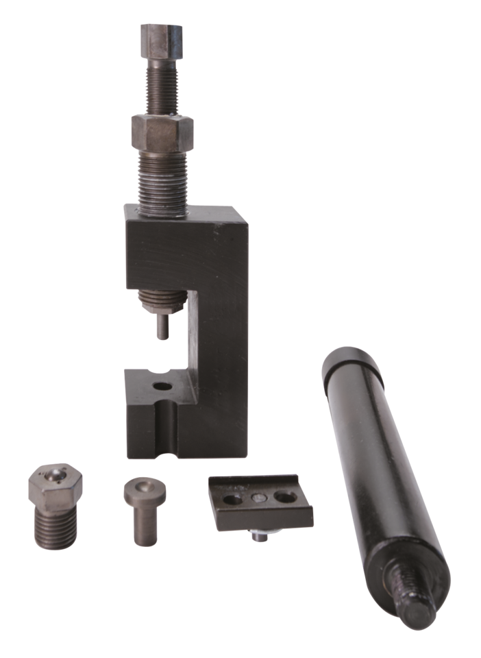 This tool is designed to break roller chains up to 630 series and fits all standard and O-ring chain sizes 520, 530 and 630. The tool rivet chains up to 530. Master link side plate press kit is included to press-fit side plates on chains up to 530. The screws and attachments of the tool are heat treated for strength and durability. The extractor pin is precisely guided by a removable guide ensuring long pin life. The tool may be bolted to a workbench, supported in a vise, or held by handle. When bolted to a solid surface, air or electric wrenches may be used to break chain. This jumbo chain tool is recommended for heavy-duty use. Instructions are included.