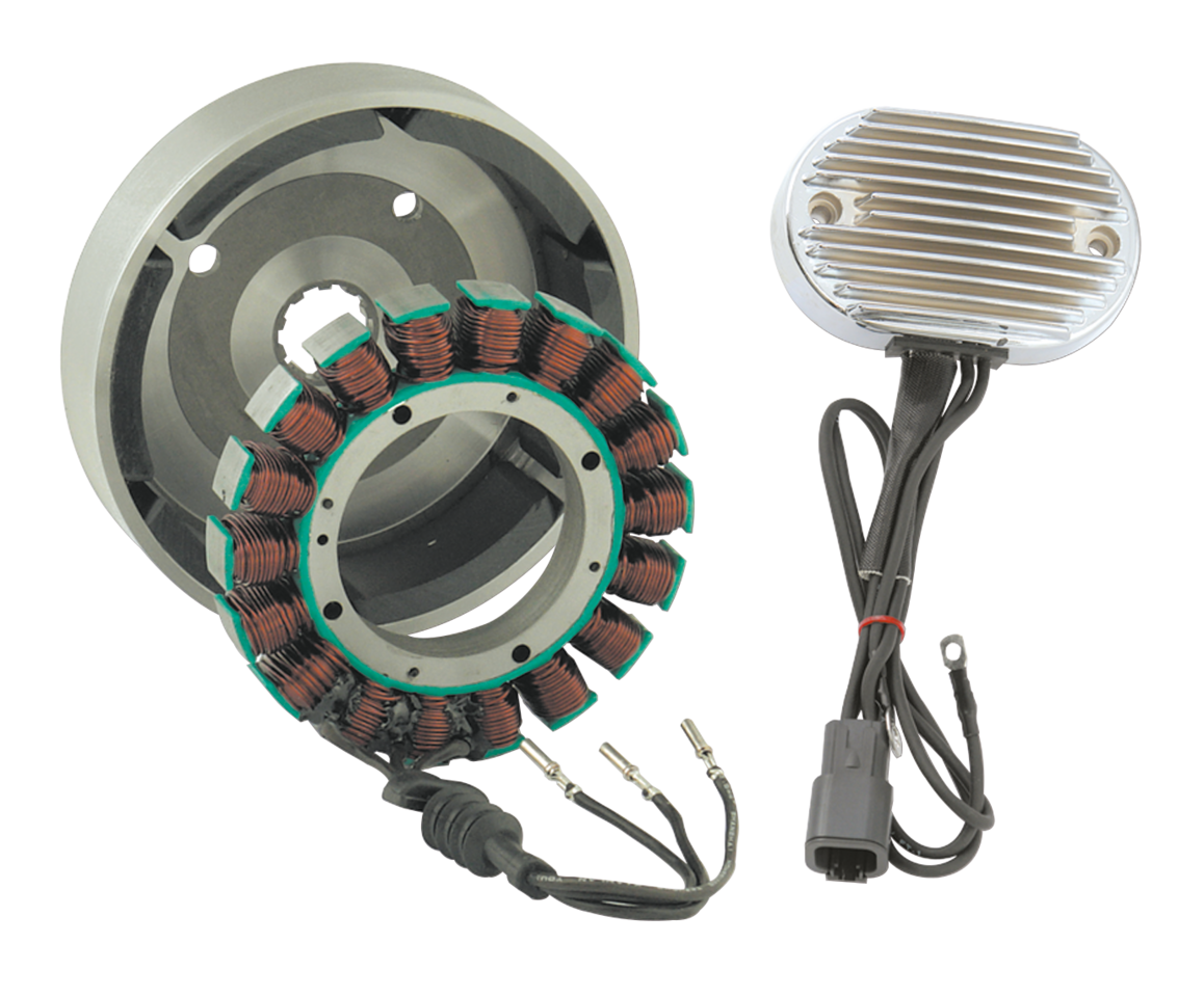 Complete High Output charging systems with a high performance rotor, stator and voltage regulator. Come as complete kits with a chrome plated voltage regulator. All parts are also separately available.