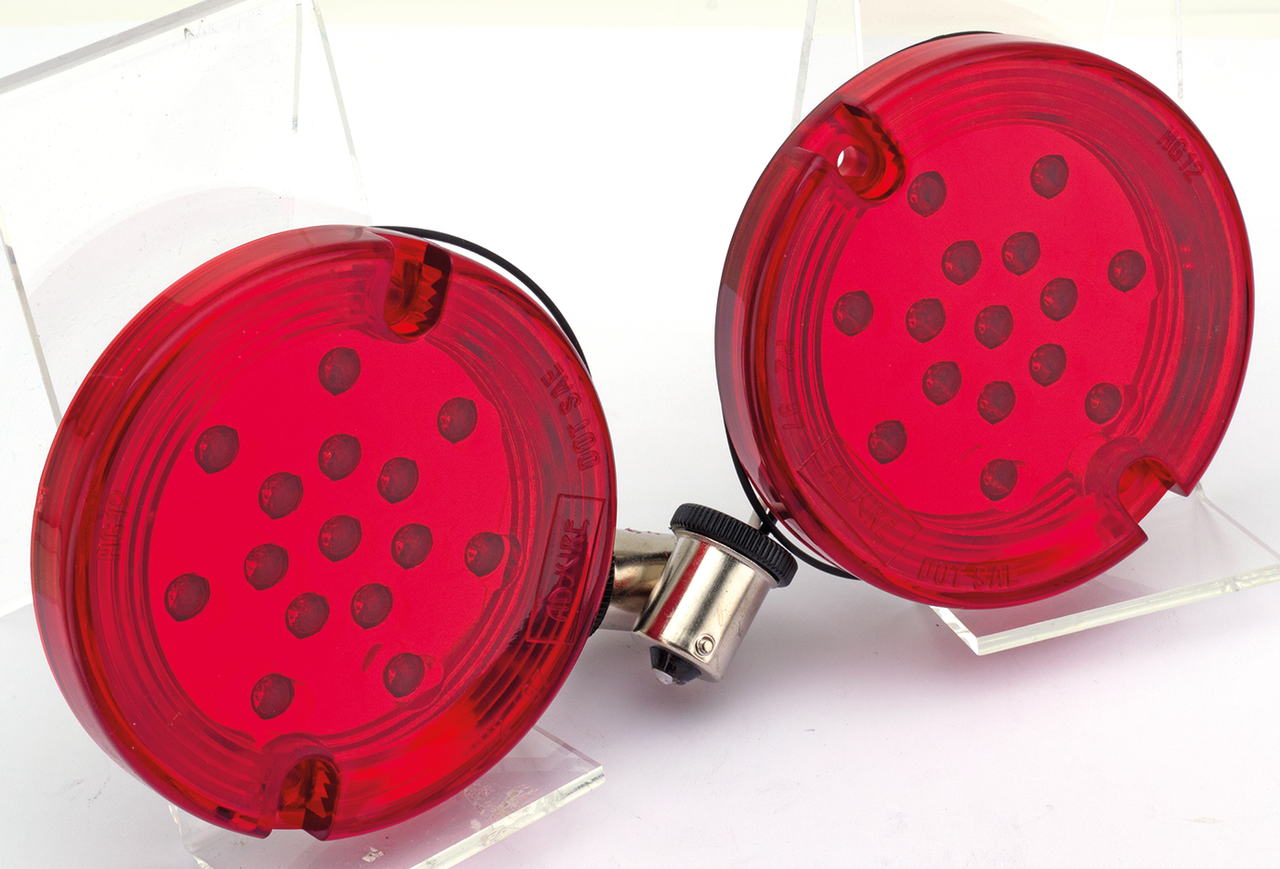 Change your stock Harley turn signals into something brand new and very exciting. These LED (Light Emitting Diodes) Turn Signal Upgrade Kits are very easy to install with no more tools than a screwdriver. Kits come with a see-through flat lens to show the LED’s, which are available in "Target", "Galaxy" and "Hexagon" pattern. Every kit contains two LED panels and two lenses. Dual Beam kits contain two LED panels and two lenses are turn signal/running light combinations and are available in amber, Single Beam kits replace single filament turn signals in your choice of amber or red.
