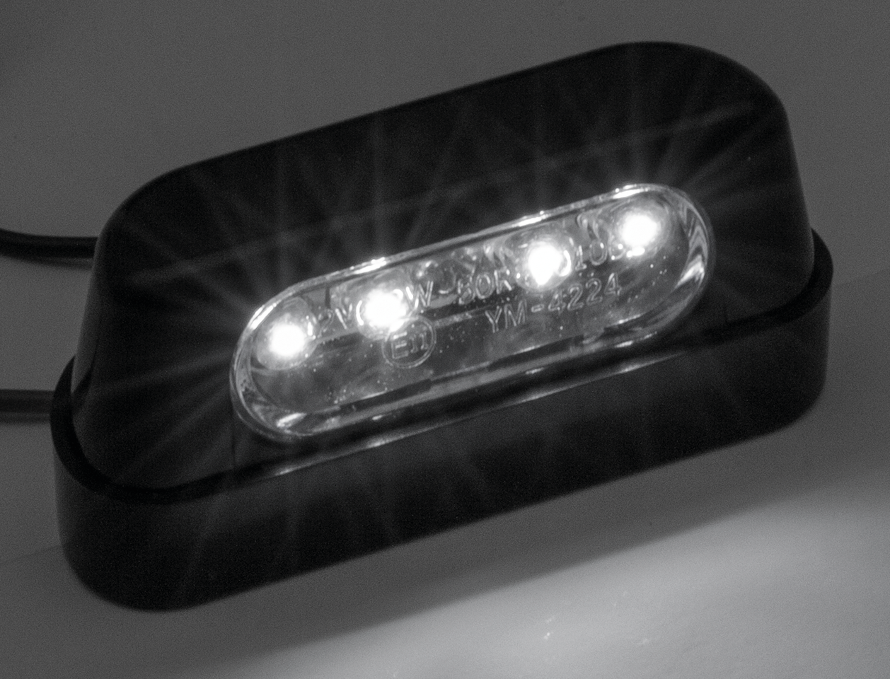 Only 56mm long, 20mm high and 25mm deep clear license plate light with four LEDs in a black plastic housing.