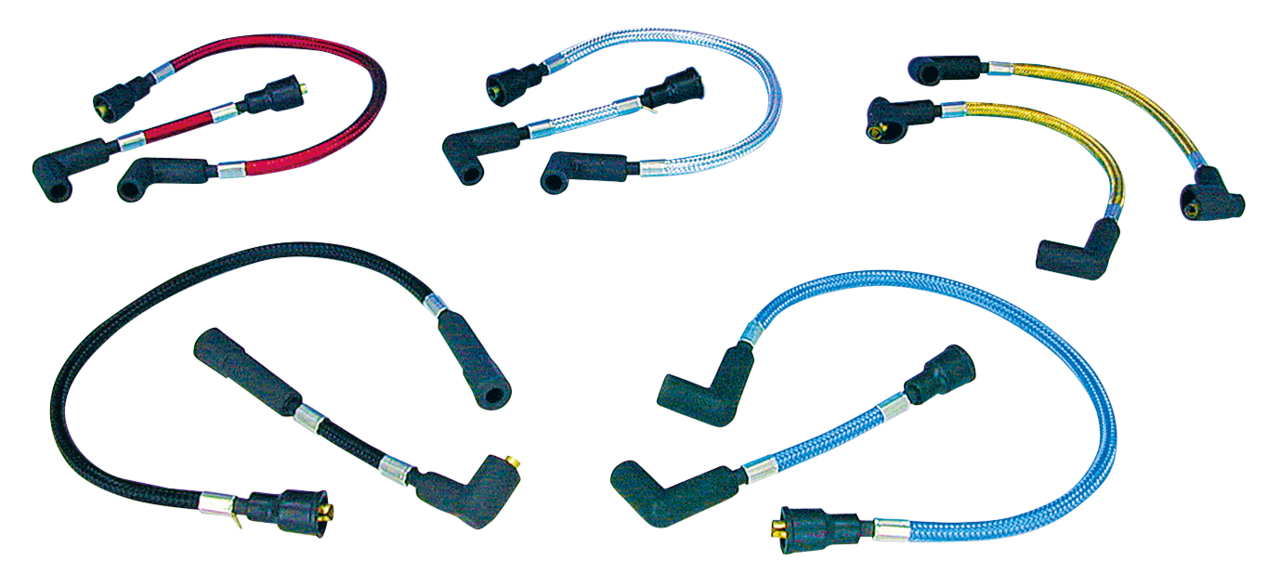 Braided steel suppression core ignition wire sets to fit Sportster, Shovelhead, Evolution and Twin Cam models. Magnum wires withstand surface contact temperatures over 1.000°F (540°C), resisting wire scorch resulting from head contact. Wires feature unparalleled noise suppression, eliminating interference with radios and CB units. Available in five colors, complete with mounting clamps and ground wires.