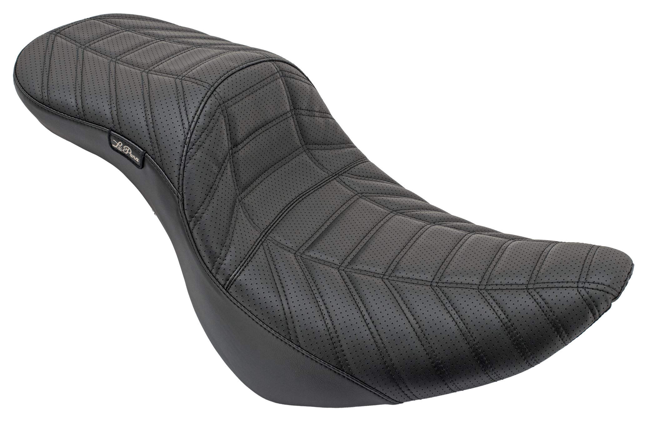 Inspired by track days, this race ready version of our popular Maverick will offer you both style and long term comfort, utilizing our sporty perforated vinyl for the seating areas tied with our signature double track pleat stitch. Its nothing but ready for any type of two wheel traveling you might do. So whether you are bound for the race track or hitting the highway you have nothing to compromise with the Maverick Indy. The drivers area is 14″ wide and passenger seating, a very comfy 11.5″ wide with 7″ of back support. Available in standard and Daddy Long Legs version which moves the rider 2″ back from the standard version. Fits FLSB Sport Glide, FXLR Low Rider, FXLRS Low Rider S and FXLRST Low Rider ST 2018 to present.