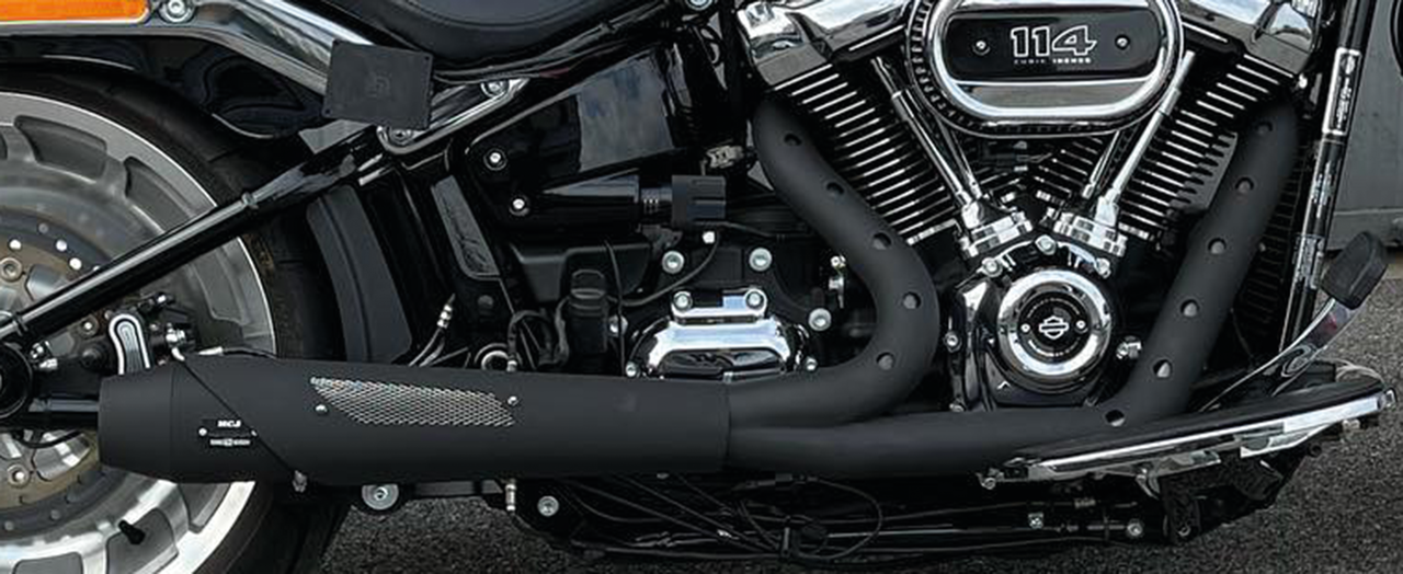 Fits 2021-2024 European (VIN starting with 5HD1) FLFBS Fat Boy, FLHC & FLHCS Heritage, FLSB Sport Glide, FLSL Slim, FXBRS Breakout, FXFBS Fat Bob, FXRST El Diablo, FXLRST Low Rider ST and FXST Standard (Euro-5), Shorty system, black, MCJ 2-1 Shorty ST21-24 Black, MCJ