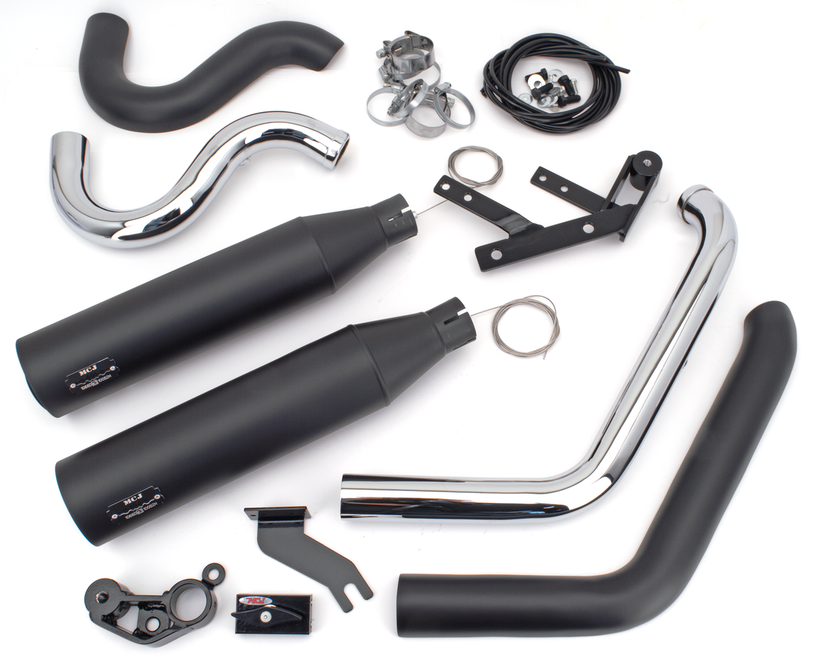 FLFBS Fat Boy, FLHC & FLHCS Heritage, FLI Hydra Glide Revival, FLSB Sport Glide, FLSL Slim, FXBR & FXBRS Breakout, FXFBS Fat Bob (Euro-5) 2021-2024, fits forward control and floorboard models, Big Short 2-into-2 system with closed heatshields, black, without MCJ 90mm end caps, MCJ 2-2 Big Short ST21-24 Black Plain, MCJ