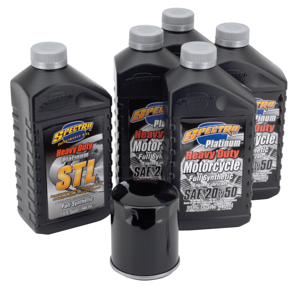 Easy does it! Just one part number to get everything you need for an engine oil change, a complete oil change or an oil change complete with a spark plugs change. We have selected for you the right type of Spectro oils, volumes, right oil filter in black or chrome and put these together in one box. We also have kits that include the correct spark plugs. And for the most demanding riders with a 2006 or later 6-speed transmission we have Platinum Plus kits available that include Spectro’s special formulated noise-killing Platinum Gear oil. All kits are available with your choice of chrome plated oil filter or black painted oil filter.