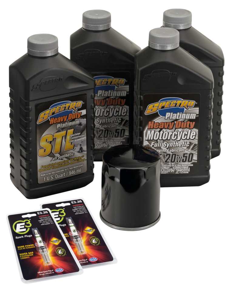 Easy does it! Just one part number to get everything you need for an engine oil change, a complete oil change or an oil change complete with a spark plugs change. We have selected for you the right type of Spectro oils, volumes, right oil filter in black or chrome and put these together in one box. We also have kits that include the correct spark plugs. And for the most demanding riders with a 2006 or later 6-speed transmission we have Platinum Plus kits available that include Spectro’s special formulated noise-killing Platinum Gear oil. All kits are available with your choice of chrome plated oil filter or black painted oil filter.