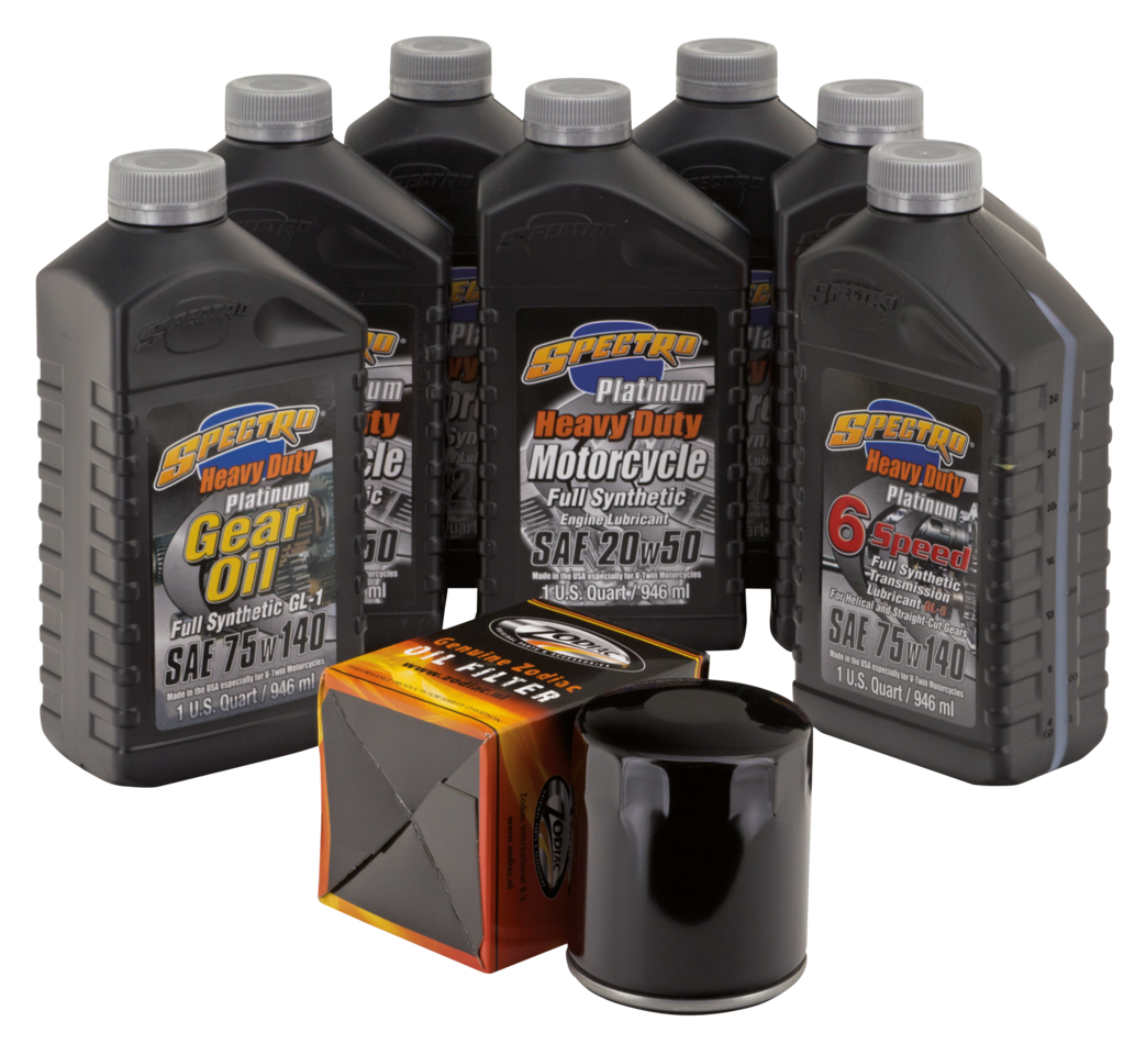 Easy does it! Just one part number to get everything you need for an engine oil change, a complete oil change or an oil change complete with a spark plugs change. We have selected for you the right type of Spectro oils, volumes, right oil filter in black or chrome and put these together in one box. We also have kits that include the correct spark plugs. And for the most demanding riders with a 2006 or later 6-speed transmission we have Platinum Plus kits available that include Spectro’s special formulated noise-killing Platinum Gear oil. All kits are available with your choice of chrome plated oil filter or black painted oil filter.