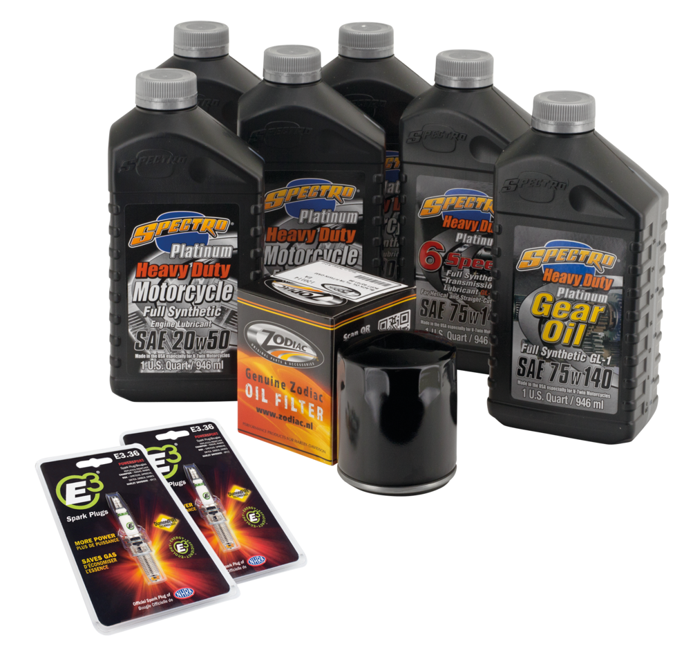 Easy does it! Just one part number to get everything you need for an engine oil change, a complete oil change or an oil change complete with a spark plugs change. We have selected for you the right type of Spectro oils, volumes, right oil filter in black or chrome and put these together in one box. We also have kits that include the correct spark plugs. And for the most demanding riders with a 2006 or later 6-speed transmission we have Platinum Plus kits available that include Spectro’s special formulated noise-killing Platinum Gear oil. All kits are available with your choice of chrome plated oil filter or black painted oil filter.