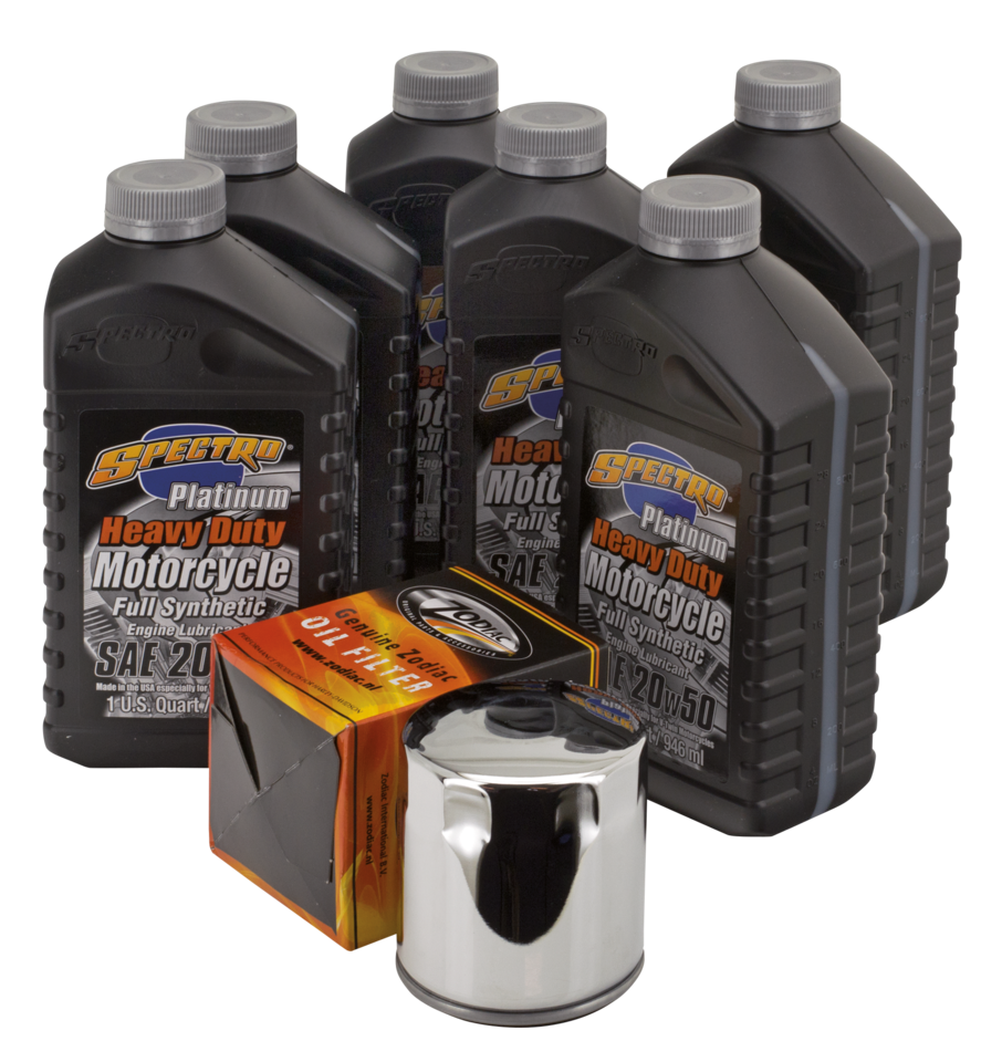 Easy does it! Just one part number to get everything you need for an engine oil change, a complete oil change or an oil change complete with a spark plugs change. We have selected for you the right type of Spectro oils, volumes, right oil filter in black or chrome and put these together in one box. We also have kits that include the correct spark plugs. And for the most demanding riders with a 2006 or later 6-speed transmission we have Platinum Plus kits available that include Spectro’s special formulated noise-killing Platinum Gear oil. All kits are available with your choice of chrome plated oil filter or black painted oil filter.