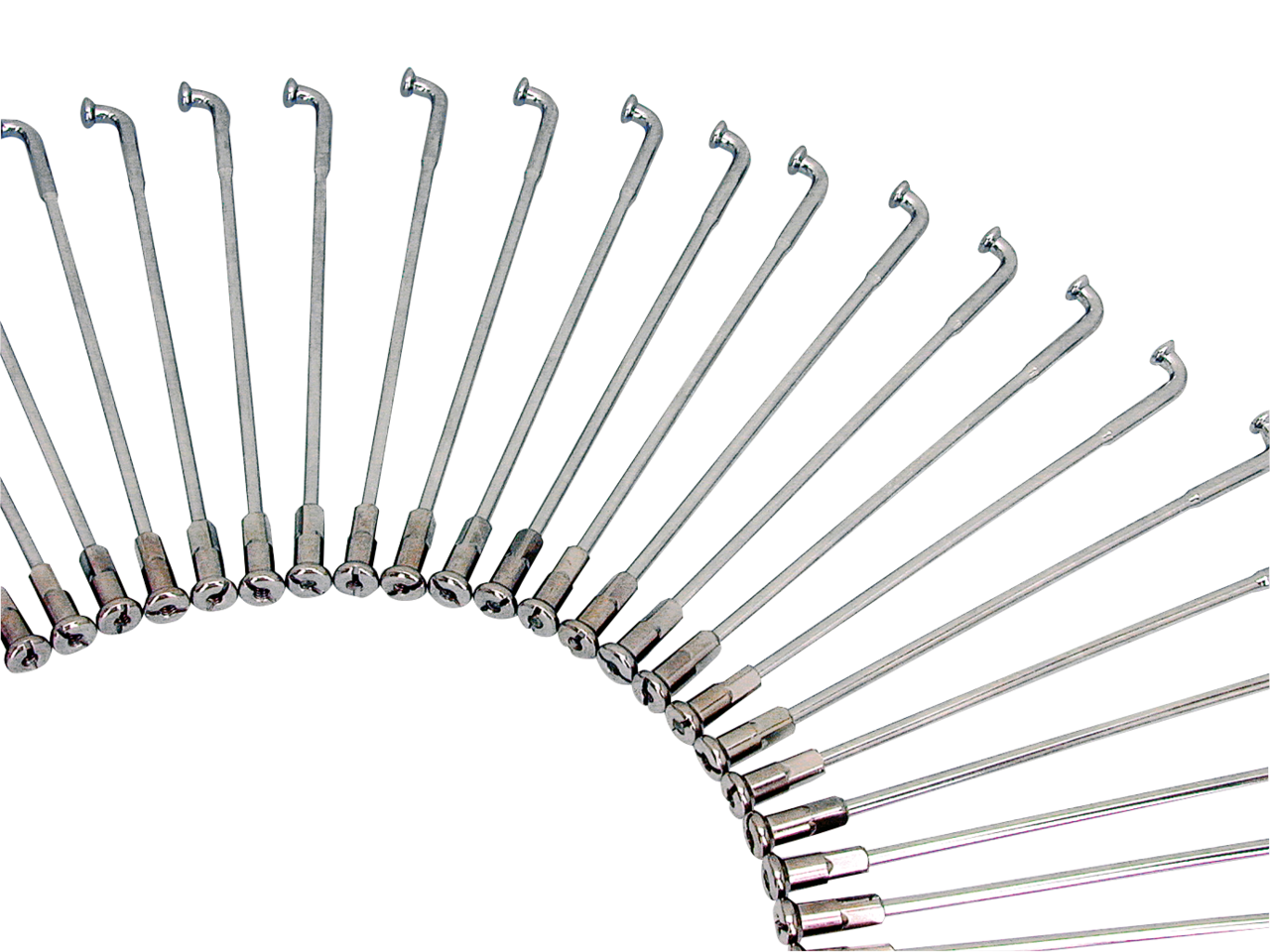 Zodiac offers the wheel builder a complete selection of top quality spokes in both polished Stainless Steel and Chrome plated carbon-steel sets. Combining outstanding strength with light weight and flexibility, the selection of spokes covers virtually every application from replacing original equipment to creating a complete new custom wheel. We even have spokes for those who want to convert their 19" or 21" Narrow Glide front end with aluminum disc hub into a 16" wheel. Packaged and sold per kit (to lace one wheel). Note: Harley changed the rim design and spoke pattern in 2005 without changing the part numbers for the rims. The 2005-up design rims require longer spokes, reason why they refer to new part numbers for the spokes. Kits contain 40 spokes and nipples. Order 2 sets for 80 hole rims, or 3 sets for 120 hole rims. Note: Stainless steel spokes and nipples are made from different types stainless material to minimize their seizing to each other, however, we strongly recommend the use of an anti-seize compound when assembling these spokes.