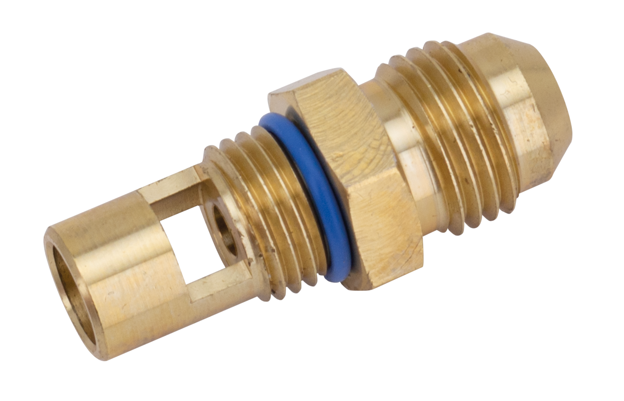 Brass float valve seat for use with 6AN threaded fuel line fitting in S&S Super E and Super G carburetors. Can also be used to connect to 6AN threaded fuel valves.