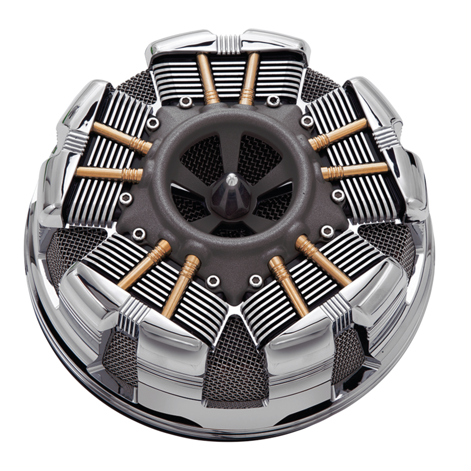 This Ciro design, chrome air cleaner makes a statement. Inspired by the power and beauty of classic, air cooled aircraft engineering. The aluminum body features brass pushrods and precision machined engine components. Legroom is not an issue as this assembly sits closer to the engine than the stock air cleaner. The innovative design incorporates an OEM style crank case breather, and the included Ultra-Flow performance filter produces a massive 45% increase in air flow over a stock 2014 air filter. Fits all 2008-2016 Touring and Trike, as well as Fuel Injected Throttle-By-Wire Softail and Dyna thru 2017.