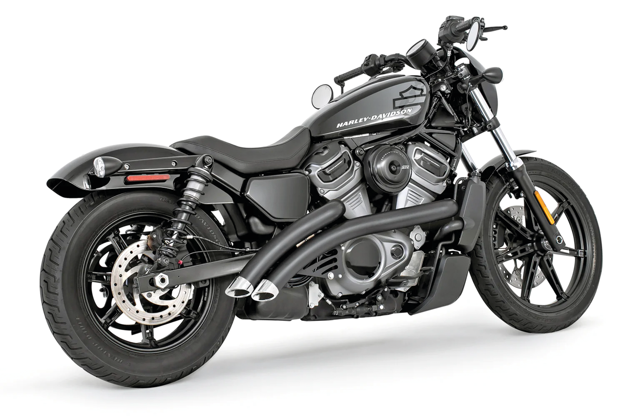 Fits 2022 to present RH975 Nightster and RH975S Nightster Special, Black with chrome Slash Cut end caps, RADICAL RADIUS BL/CH SIDE RH975 21-UP, Freedom Performance Exhaust