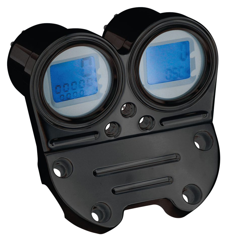 RBS Angled Dual Pullback Handlebar Speedo/Tacho combo Speedo and tacho integrated in a billet aluminum 40 degree angled bracket that bolts straight on to all 1973 to present models with 3 1/2″ (89mm) center-to-center risers with offset mounting holes.. Bracket is 6 7/32″ (158mm) long and 5 11/16″ (144mm) wide. Indicator lights not included., Black