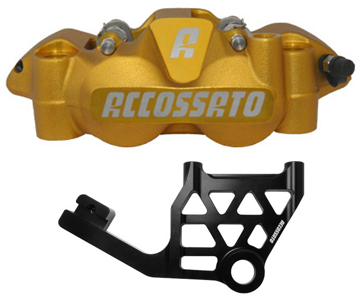 The new brake radial caliper, composed by 2 pieces and billet made, enriches the Accossato calipers range. Caliper is designed with the most advanced technology, using the best materials on the market. A clear example is given by the structure of the calipers, CNC-machined with 5 axes. The shape of the calipers has been realised with the support of CAD research in order to obtain the lightest weight, the best rigidity of the body and the best heat loss capacity throughout a special treatment in hard oxidation. During the machining, the body of the caliper is 100% controlled by the three-dimensional lab machines. Calipers have 108mm center to center distance of the mounting bolt holes. Accossato suggests using DOT 4 brake fluid in their calipers. Calipers are supplied with sintered brake pads.