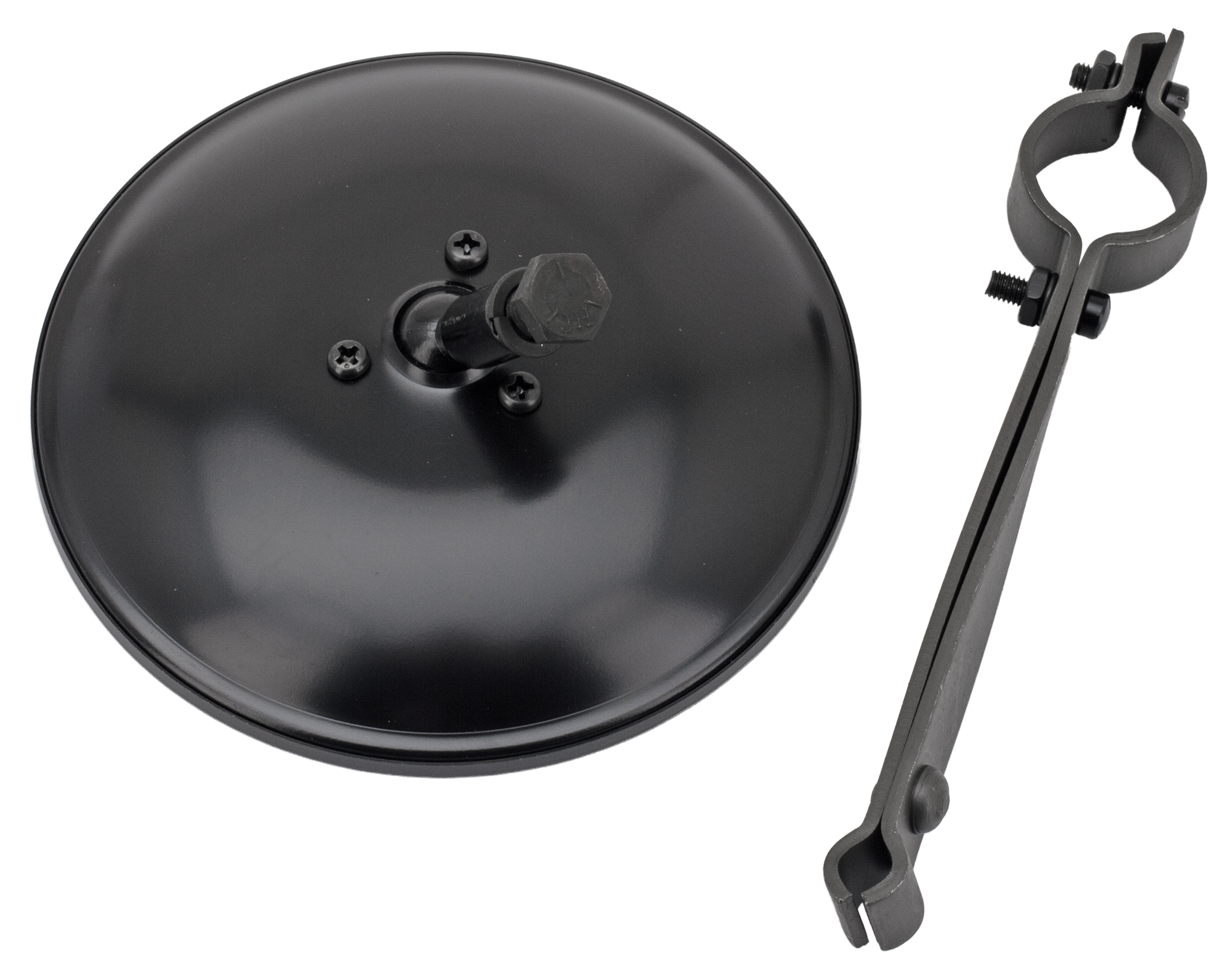 Replica early style round mirror, black finish. Face is 5″ with parkerized stem. Clamps to a 1″ handlebar. Stock replacement for most models 1934-1957 with springer front forks.