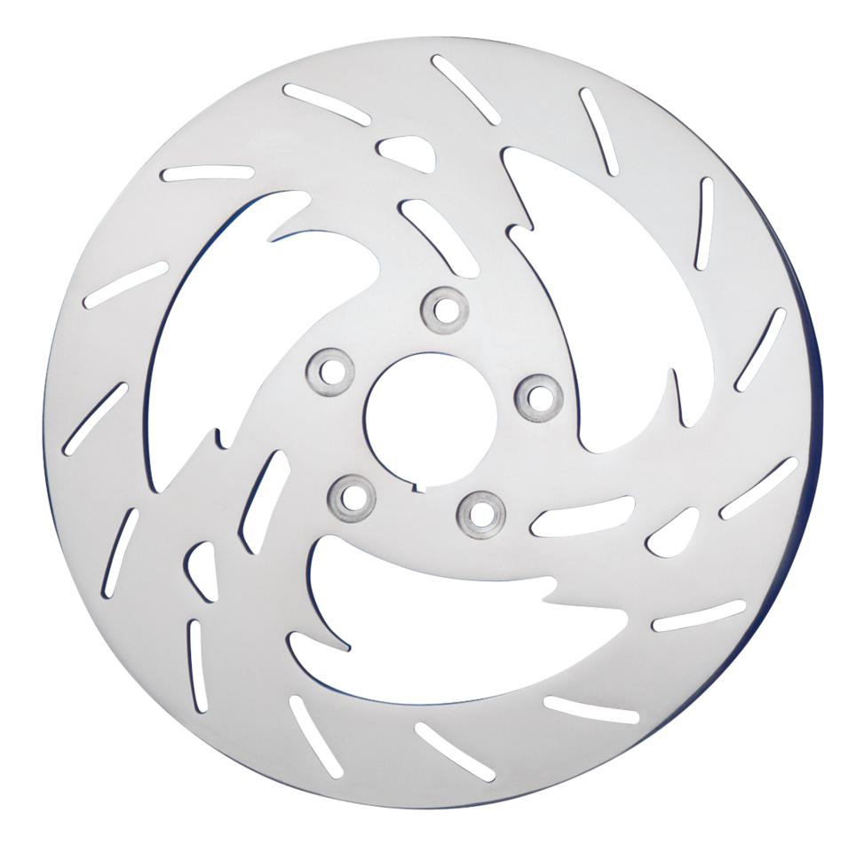 Emphasize the good looks of your Rick’s wheels with these matching design disc brake rotors. Made from Stainless Steel with the same quality standards polished finish. Discs fit all Rick’s wheels in conjunction with OEM or aftermarket brake calipers. Discs also fit 2000 to present stock style wheels, front on 2000-2013 Sportster, 2000-2007 Touring, 2000-2005 Dyna and 2000-2014 Softail. Fits rear on 2000-2011 Sportster (except 2011 with wire wheels), 2000-2017 Dyna, 2000-2017 Softail and 2000-2007 Touring. Discs have a 2.22″ (56mm) inner diameter and are drilled for five 5/16″ counterbore screws on a 3 1/4″ (82.6mm) circle. For rear applications the bolt holes must be enlarged to accept 3/8″ bolts. Available in various designs and 10″, 11 1/2″ and 13″ diameter.
