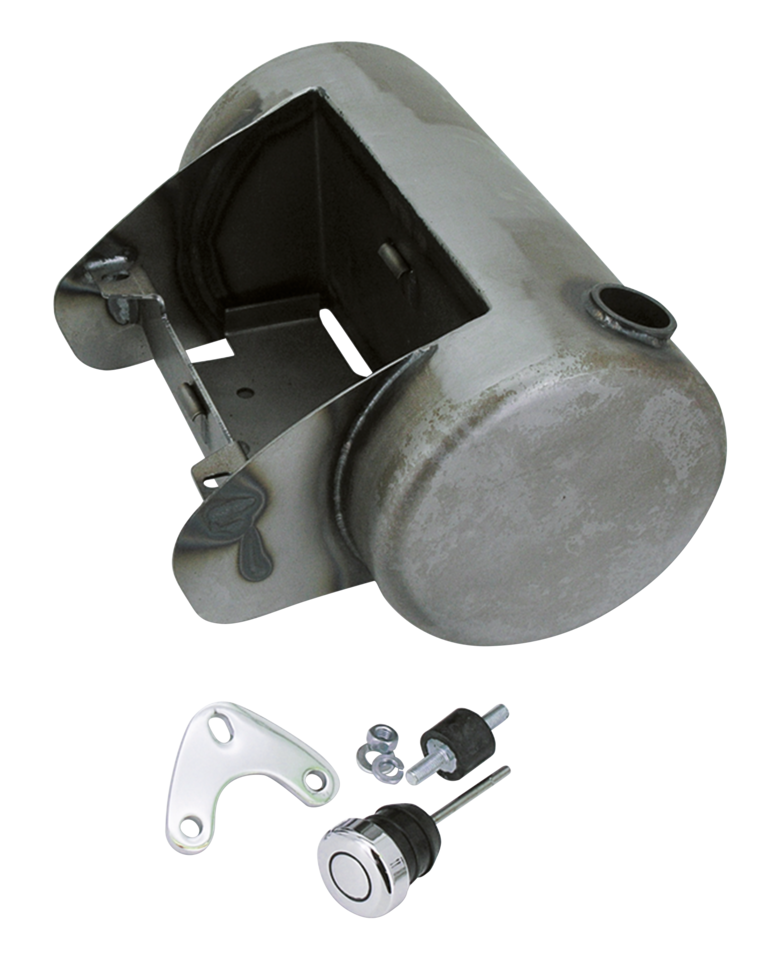 These custom deep drawn oil tanks are handcrafted from 16 gauge steel and feature a battery box for Softail style batteries. They take 3 1/2 Quart (3.3L.) of oil and 1/8″ NPT oil line fittings and come with a plated cap. Tanks are 6 1/2″ (16.5 cm) in diameter and 11 3/4″ (30 cm) in width. They have gap concealing wings left and right and come in ready-for-prep-and-paint raw steel. Available with equal length wings for stock Softail, Kraft/Tech Softail frames thru 180 rear tire, most aftermarket Softail style frames, and rigid (hardtail) frames for Big Twin. Also available to fit our Kraft/Tech Softail style frames for 200 thru 250 series rear tire, these have unequal length wings. All tanks fit with a stock Softail-style rear oil tank bracket.