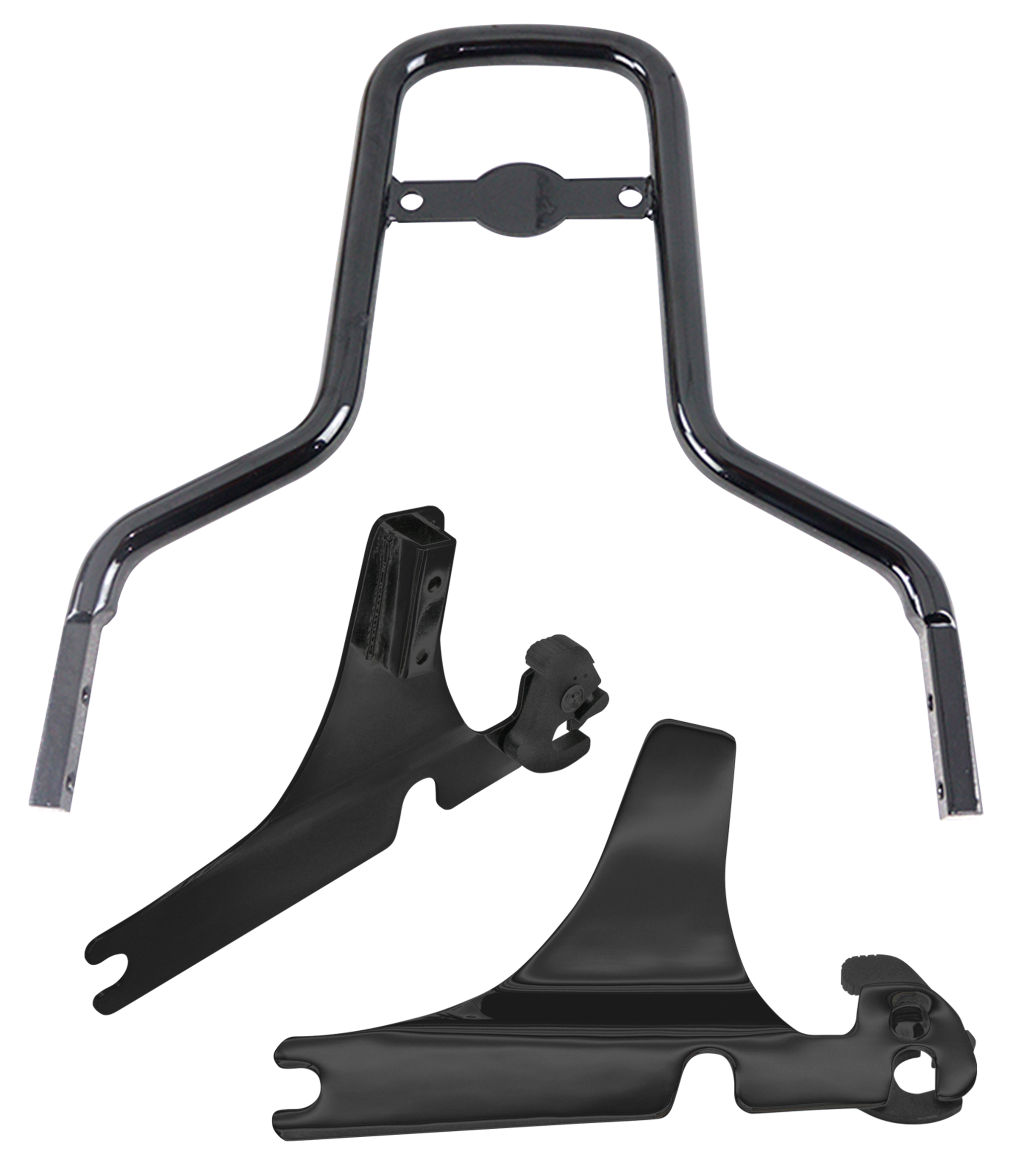 Round bar sissy bar upright with 2-bolt pad mount is 11″ (28cm) high and bolts to the detachable side plates. Upright, side plates and docking hardware kit must be ordered separately.