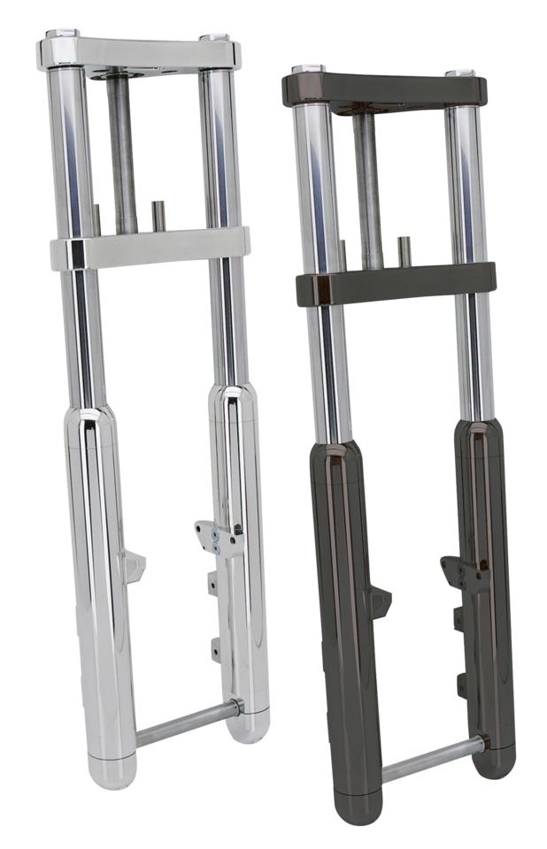 The guys at Zodiac noticed the trend of the latest custom bikes; Narrow is cool too. This resulted in a special Narrow version of the famous Bubba front fork called the Slim Bubba. With a pitch of 195mm it is just wide enough to take a Narrow Glide front hub and a stock or stock style brake caliper. Triple trees and sliders are billet aluminum with a mirror shine polished or polished black finish. With its classic round lines the fork has a nostalgic appearance, but with modern day handling characteristics. The upper triple tree clamp is 1 1/8″ (29mm) thick, the lower triple tree clamp measures 1 5/16″ (34mm). The fork sliders have a very impressive diameter of 2 3/8″ (60mm), feature fender brackets and mounting blocks to take both left and right side calipers. Conversion brackets that take 1984-1999 style aftermarket calipers or 2000 to present style OEM or aftermarket brake calipers can be ordered separately. The front wheel axle has a hidden mount for extra sleek looks and the fork sliders are topped off with billet aluminum dust covers. Forks are available in various lengths and with 0, 3, and 6 degrees raked triple trees and include 3 different fork stops to work with almost any stock or aftermarket frame. A bottle of fork oil is included with each set. Installation on 2006-2017 Dyna requires the separate purchase of a longer neck post ZPN 600126.