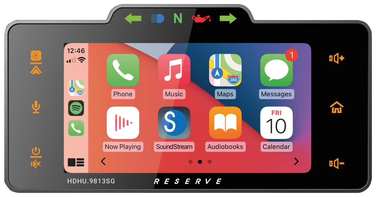 Plug-N-Play Soundstream Reserve Motorcycle Audio by Precision Power are upgrade head units for OEM Harley-Davidson radios. Apart from the regular AM/FM radio and Bluetooth connection for phone calls and music, these units allow you to do the things you want as you can do in your car using Apple CarPlay or Android Auto. By plugging in your phone using the USB outlet, for V-1 systems or wireless connecting for V-2 systems, you can get riding directions, send and receive messages and listen/browse music, all in a way that allows you to stay focused on the ride. You can even use Siri on your Apple phone or the Google Assistant on your Android phone to find fuel stops along your journey. You can see it all on your radio’s touchscreen display, helping you know more about what’s nearby. The apps themselves have been reimagined for easier viewing, so you can use them while your eyes and hands stay where they belong on the road. Head units feature 7″ (17.8cm) capacitive High-Definition touchscreen with customizable wallpaper/background .jpg & .jpeg via USB, USB Smartphone charging while connected (5V/1.5A), Low-Pressure IPx5 Rated Water Protection, built-in Equalizer, MP3/WMA/AAC/FLAC audio playback via USB (64GB Max), 50w per channel, 2 Ohm stable 4-channel amplifier, and 4V RCA Pre-outs, UV protection and conformal coated circuits. Units are bolt-in using the stock mounting hardware.