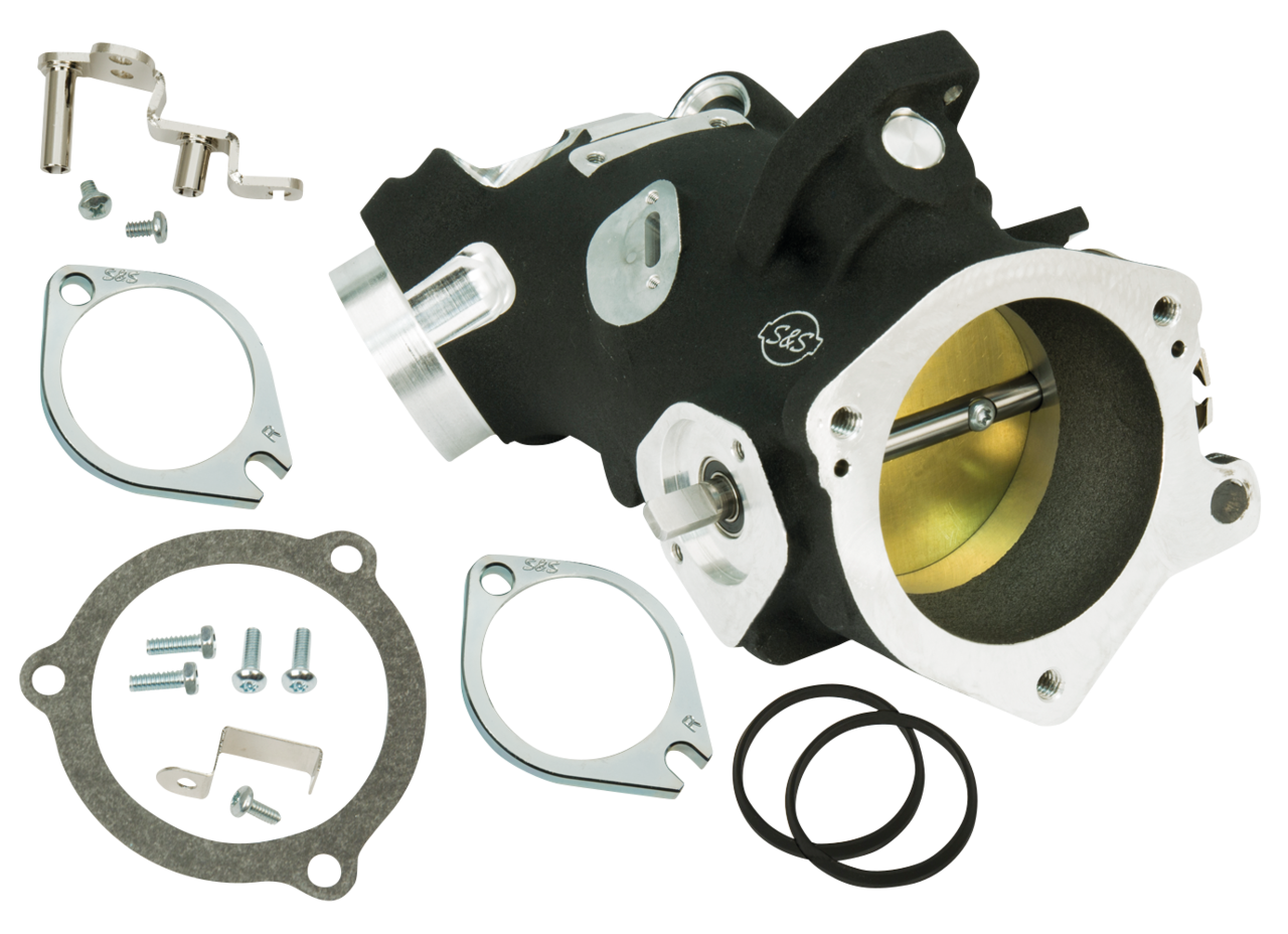 More Air, More Power! S&S Throttle Hog Throttle bodies are available for 2002-2017 Harley-Davidson Twin Cam engines with cable operated throttle. Choose from 58mm for stock or mildly built engines, or the whopping 66mm Throttle Hog for Big Inch engines. Throttle bodies are a one-piece design for easy installation and have a black powder coat finish for stock appearance. They feature a sealed, stainless steel throttle shaft with dual roller bearings for smooth operation and no air leaks. Kit also include hardened steel flanges and seals. Compatible with stock throttle cables, sensors and fuel rail. The matching air cleaner kit must be ordered separately.