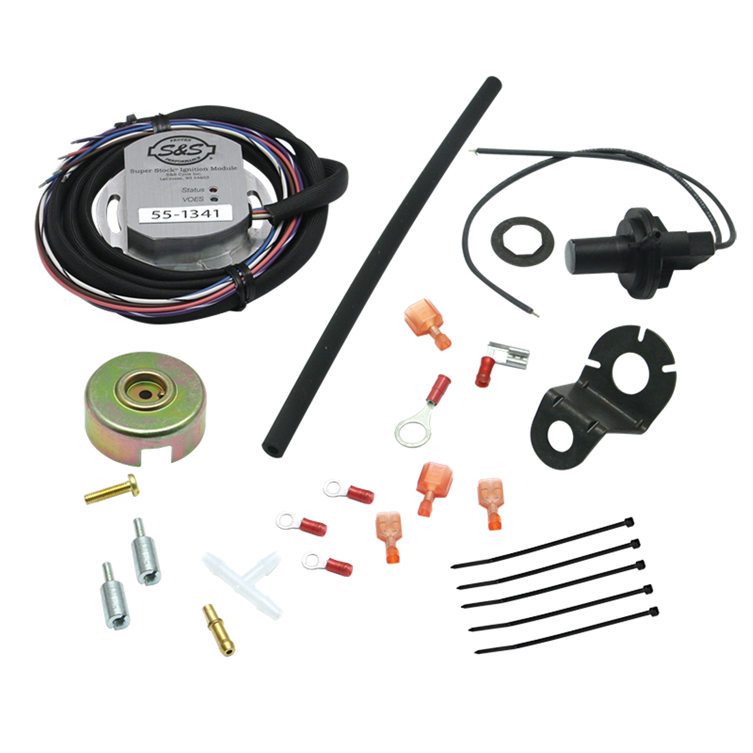 The Super Stock ignition system is primarily intended for complete S&S engines and compromises high performance for a reasonable price. It’s the right alternative for the S&S Intelligent Spark Technology (IST) ignition system or any other high performance ignition systems on the market. Like his more expensive IST brother, the Super Stock ignition system fits directly inside the Cam cover and features a similar break-in rev limit function to protect a new engine from damage with a fairly low initial rev limit. As the new engine accumulates running time, the rev limit is gradually increased. After 24 hours of operation the rev limit reaches the maximum 6,300 rpm. All Super Stock ignition systems are pre-programmed, simply because you do not need any adjustment. These programmed ignition curves are already custom tailored for the specific S&S engines. In addition to custom tailored curves, the module makes use of a Vacuum Operated Electrical Switch (VOES) to adjust timing under load or heavy acceleration to avoid detonation or knock. For technicians’ support, each system has data logging capability. The recorded data is simply accessed by connecting a PC or laptop to the tachometer wire of the ignition. Each system includes S&S Super Stock Ignition module with hardware, Pick-up rotor with mounting screw, VOES switch with hardware, and all required wiring connectors.