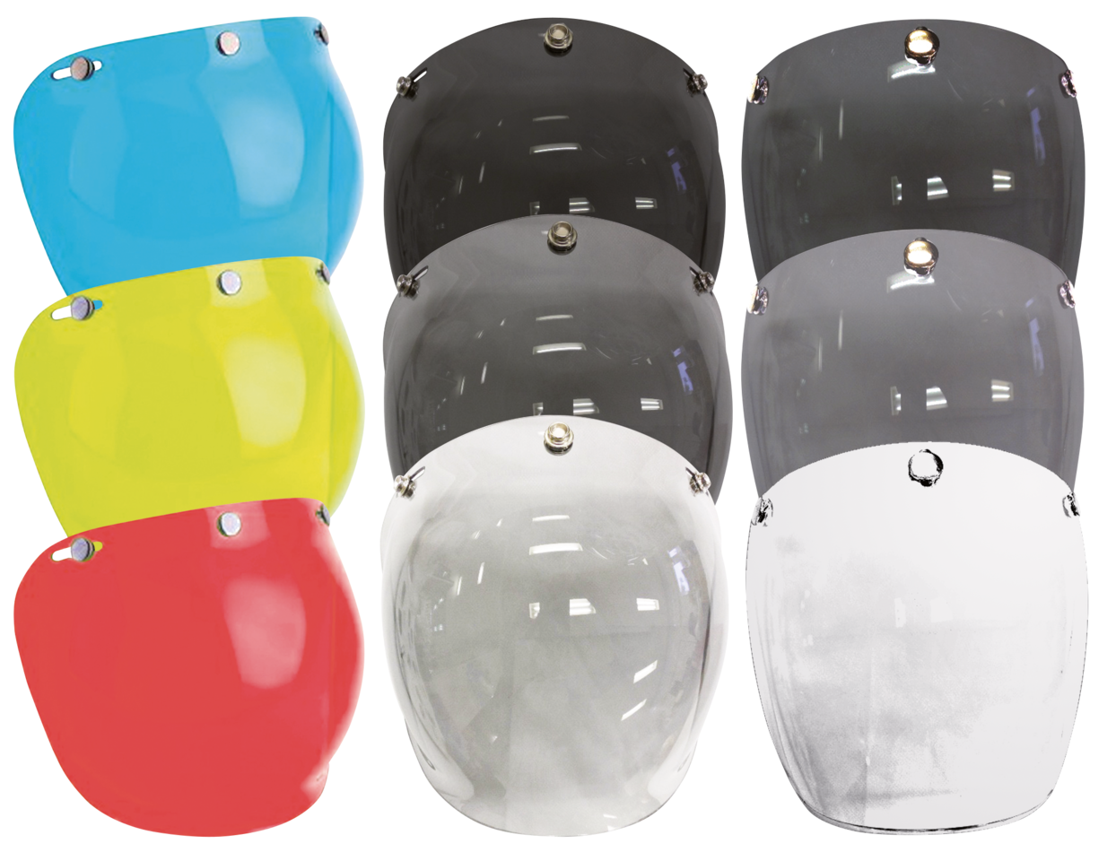 Classic flat or bubble visors fit all open face helmets with 3-snap fitment. A foldable support is available as an accessory.