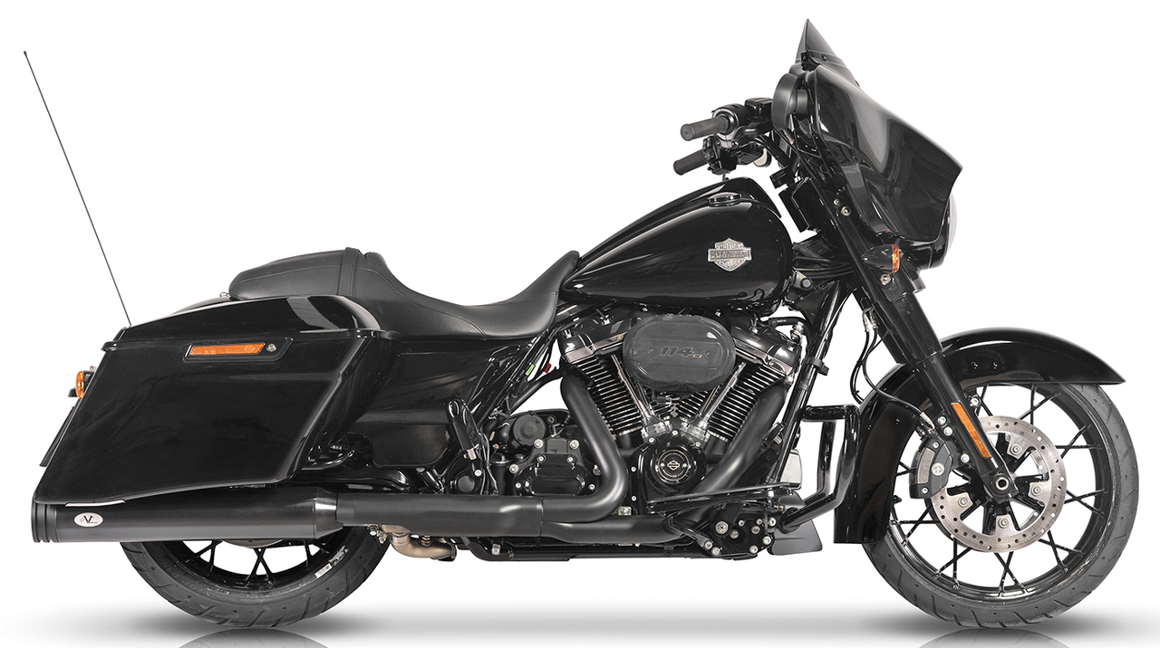 Fits European (VIN starting with 5HD1…) 2021-2024 Milwaukee Eight Touring except FLHXST Street Glide Special ST and FLTRXST Road Glide Special ST, approved for Euro-5 emission, Ceramic black 114mm diameter slip-on muffler set with straight Double-Ring end caps