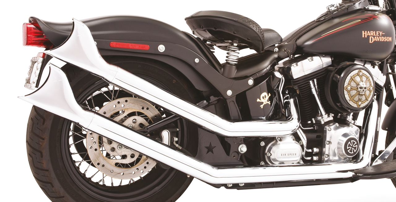 1986-2017 Softail, except Rocker & BreakoutRace version, Chrome with chrome Sharktails, UPSWEPT W/SHARKTAILS CHROME F*ST86-17, Freedom Performance Exhaust