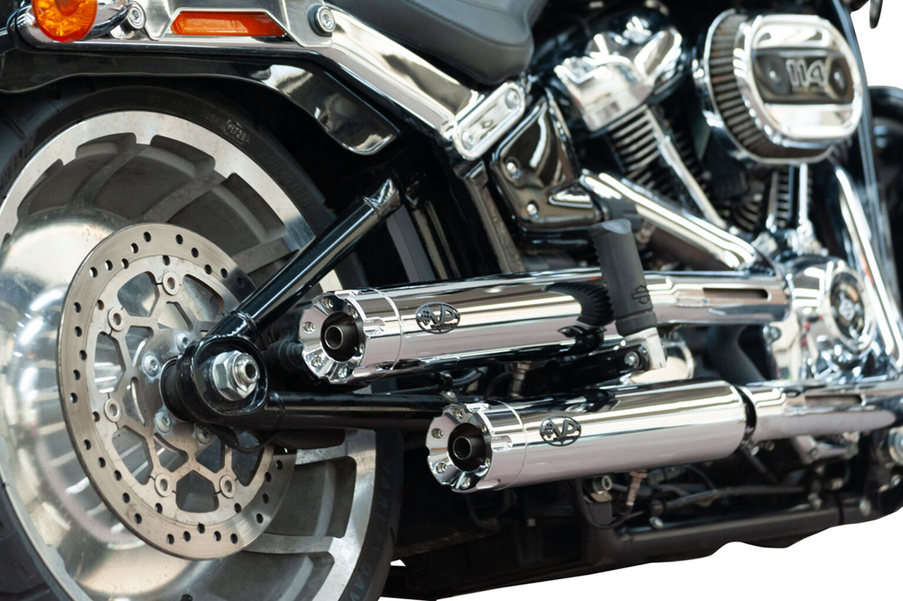Fits Breakout and Fat Boy 2021-2024, approved for Euro-5 emission, Chrome 80mm diameter slip-on muffler set with straight Revolver end caps