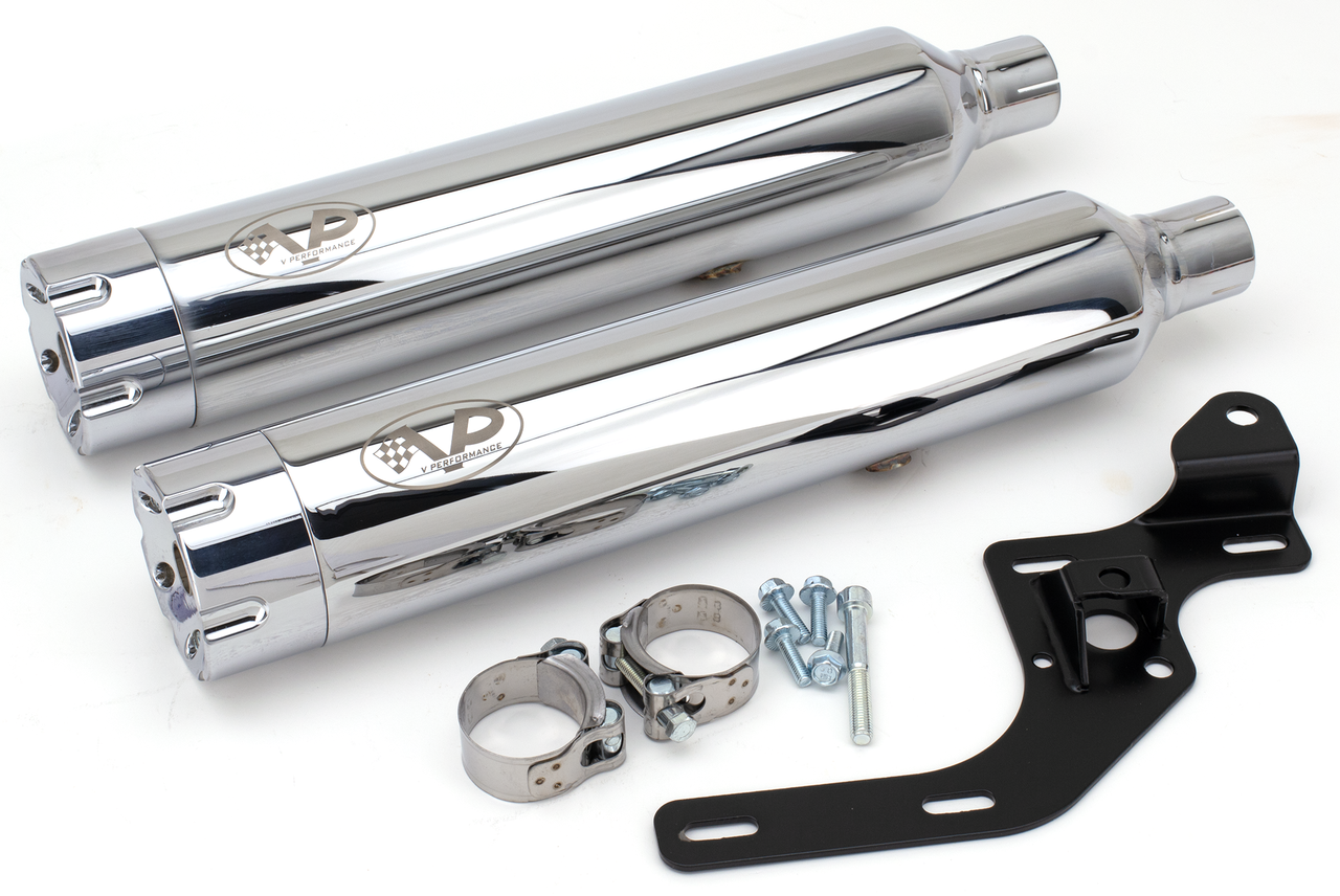 Fits Breakout and Fat Boy 2021-2024, approved for Euro-5 emission, Chrome 80mm diameter slip-on muffler set with straight Revolver end caps, V-Perf. Revolver S/O Chrome FLFB21-24, V-Performance
