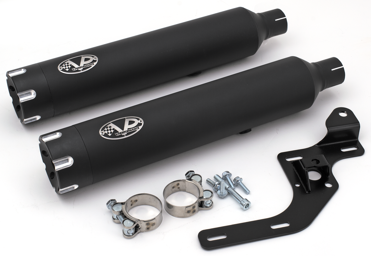 Fits Breakout and Fat Boy 2021-2024, approved for Euro-5 emission, Ceramic black 80mm diameter slip-on muffler set with straight Revolver end caps, V-Perf. Revolver S/O Dark FLFB21-24, V-Performance